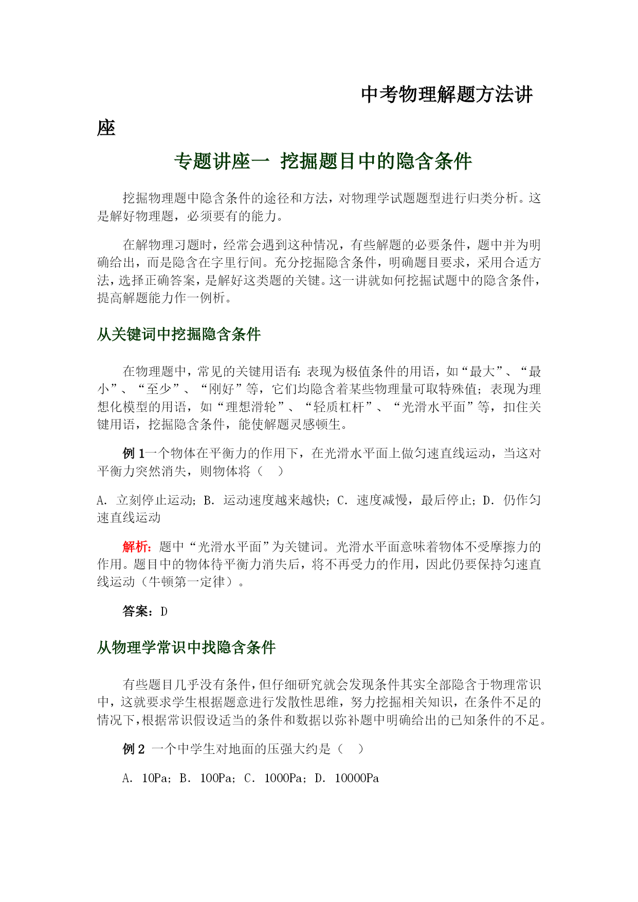 中考物理解题方法讲座专题讲座一挖掘题目中的隐含条件挖掘物理题中隐含条件的途径和方法,对物理学试题题型进行归类分析。这是解好物理题,必须要有的能力。在解物理习题时,经常会遇到这种情况,有些解题的必要条件,题中并为明确给出,而是隐含在字里行间。充分挖掘隐含条件,明确题目要求,采用合适方法,选择正确答案,是解好这类题的关键。这一讲就如何挖掘试题中的隐含条件,提高解题能力作一例析。从关键词中挖掘隐含条件在物理题中,常见的关键用语有:表现为极值条件的用语,如“最大”、“最小”、“至少”、“刚好”等,它们均隐含着某些