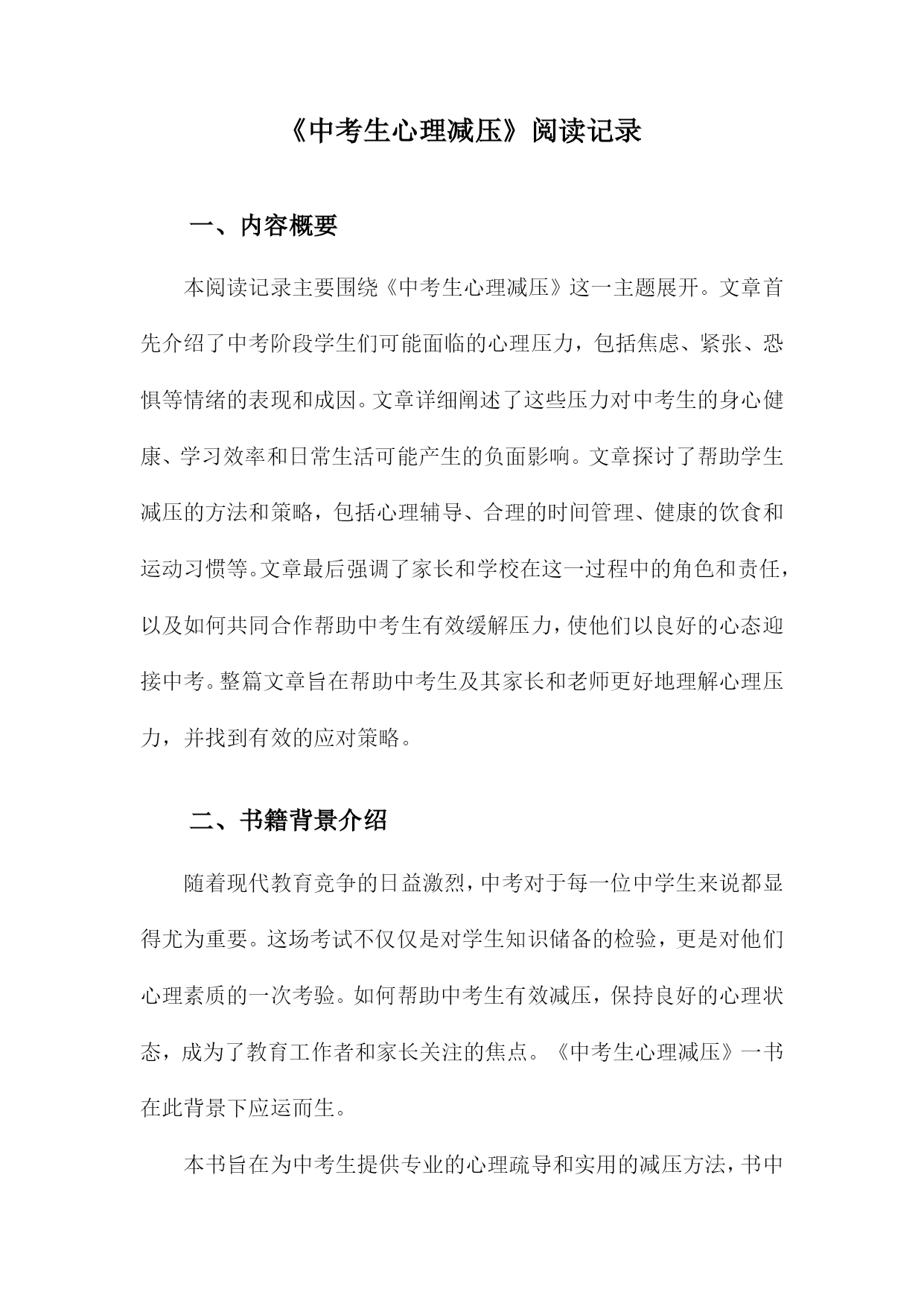 《中考生心理减压》阅读记录一、内容概要本阅读记录主要围绕《中考生心理减压》这一主题展开。文章首先介绍了中考阶段学生们可能面临的心理压力,包括焦虑、紧张、恐惧等情绪的表现和成因。文章详细阐述了这些压力对中考生的身心健康、学习效率和日常生活可能产生的负面影响。文章探讨了帮助学生减压的方法和策略,包括心理辅导、合理的时间管理、健康的饮食和运动习惯等。文章最后强调了家长和学校在这一过程中的角色和责任,以及如何共同合作帮助中考生有效缓解压力,使他们以良好的心态迎接中考。整篇文章旨在帮助中考生及其家长和老师更好地理解