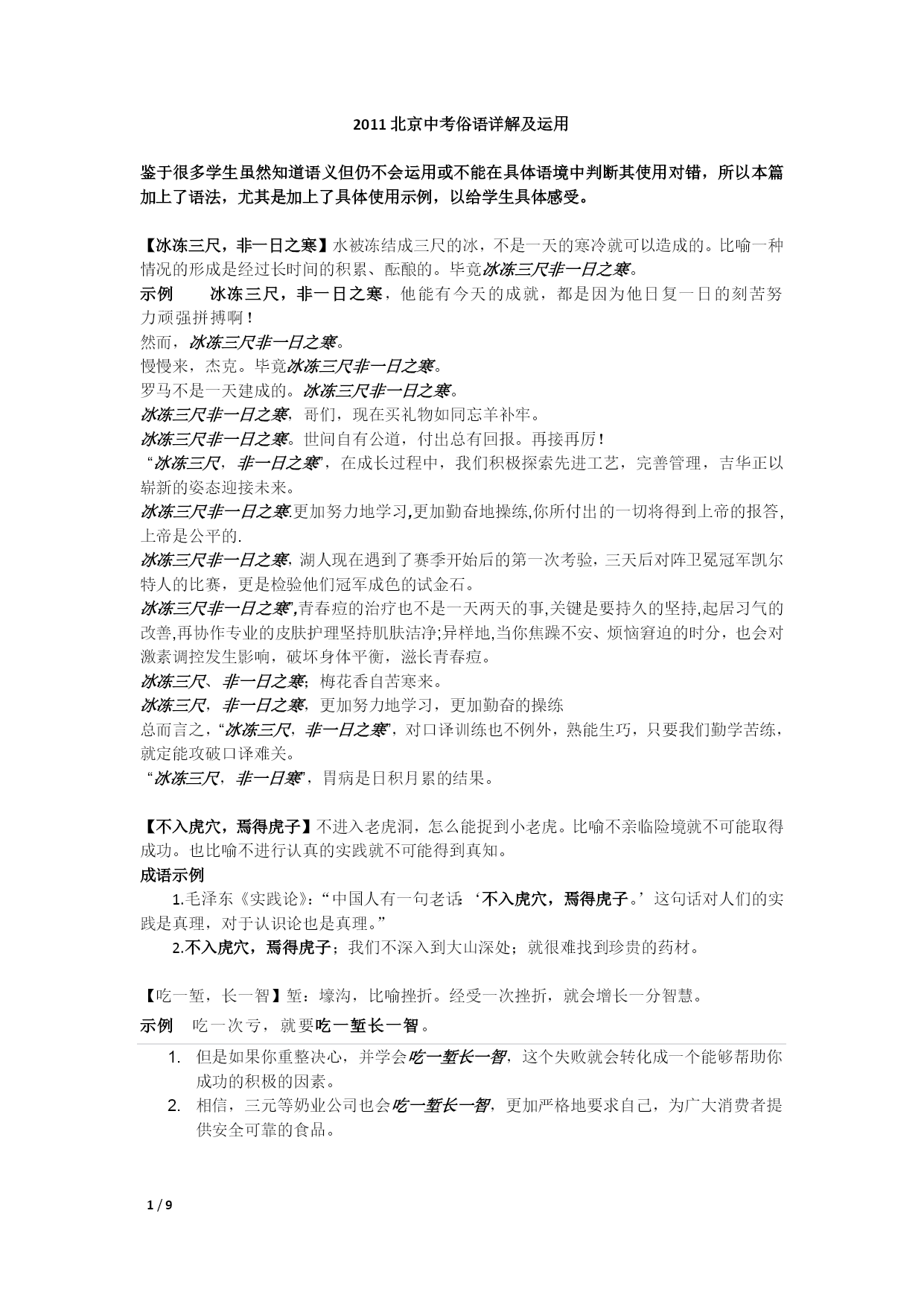 PAGE9/NUMPAGES92011北京中考俗语详解及运用鉴于很多学生虽然知道语义但仍不会运用或不能在具体语境中判断其使用对错,所以本篇加上了语法,尤其是加上了具体使用示例,以给学生具体感受。【冰冻三尺,非一日之寒】水被冻结成三尺的冰,不是一天的寒冷就可以造成的。比喻一种情况的形成是经过长时间的积累、酝酿的。毕竟冰冻三尺非一日之寒。示例冰冻三尺,非一日之寒,他能有今天的成就,都是因为他日复一日的刻苦努力顽强拼搏啊!然而,冰冻三尺非一日之寒。慢慢来,杰克。毕竟冰冻三尺非一日之寒。罗马不是一天建