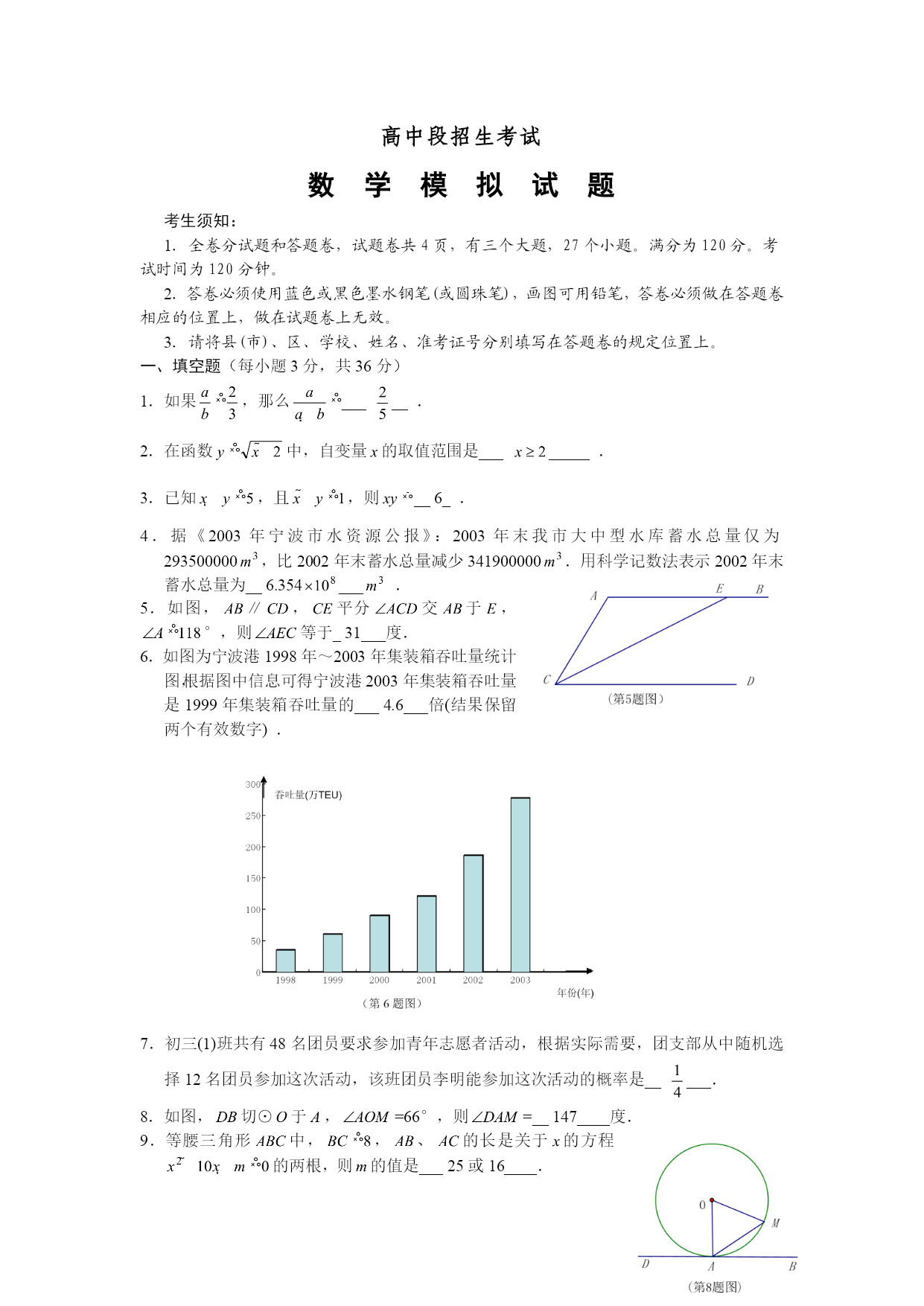 高中段招生考试数学模拟试题考生须知:1.全卷分试题和答题卷,试题卷,有三个大题,27个小题。满分为120分。考试时间为120分钟。2.答卷必须使用蓝色或黑色墨水钢笔(或圆珠笔),画图可用铅笔,答卷必须做在答题卷相应的位置上,做在试题卷上无效。3.请将县(市)、区、学校、姓名、准考证号分别填写在答题卷的规定位置上。一、填空题(每小题3分,共36分)1.如果,那么_____.2.在函数中,自变量的取值范围是________.3.已知,且,则__6_.4.据《2003年宁波市水资源公报》:2003年末我市大中型