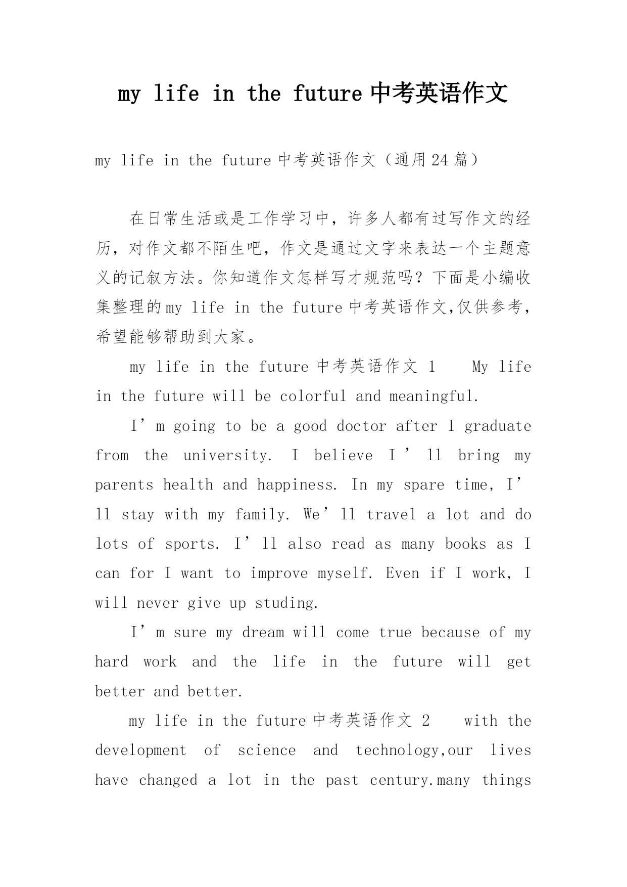 mylifeinthefuture中考英语作文mylifeinthefuture中考英语作文(通用24篇)在日常生活或是工作学习中,许多人都有过写作文的经历,对作文都不陌生吧,作文是通过文字来表达一个主题意义的记叙方法。你知道作文怎样写才规范吗?下面是小编收集整理的mylifeinthefuture中考英语作文,仅供参考,希望能够帮助到大家。mylifeinthefuture中考英语作文1Mylifeinthefuturewillbecolorfulandmeaningful.I’mgoingtobeag