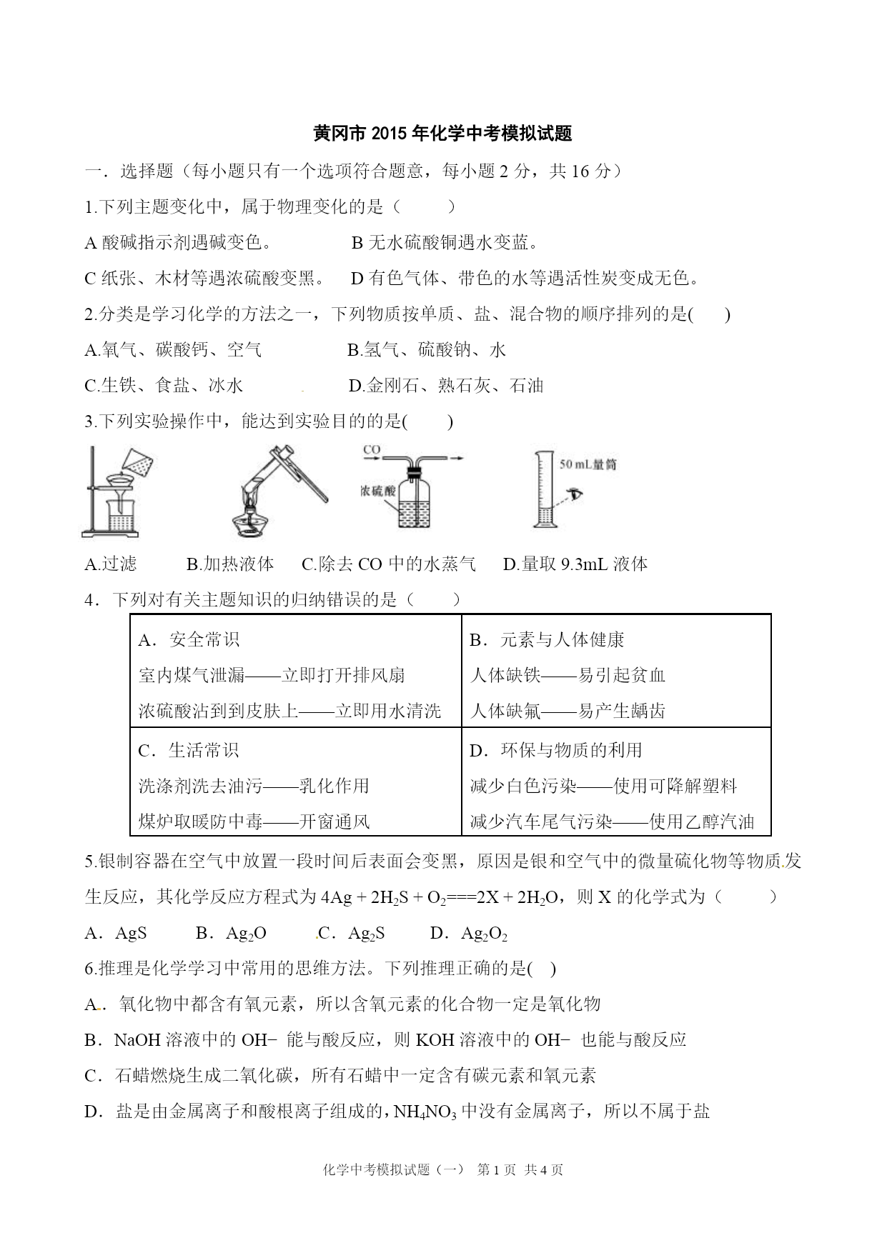 化学中考模拟试题(一)第PAGE\*MERGEFORMAT5页黄冈市2015年化学中考模拟试题一.选择题(每小题只有一个选项符合题意,每小题2分,共16分)1.下列主题变化中,属于物理变化的是()A酸碱指示剂遇碱变色。B无水硫酸铜遇水变蓝。C纸张、木材等遇浓硫酸变黑。D有色气体、带色的水等遇活性炭变成无色。2.分类是学习化学的方法之一,下列物质按单质、盐、混合物的顺序排列的是()A.氧气、碳酸钙、空气B.氢气、硫酸钠、水C.生铁、食盐、冰水D.金刚石、熟石灰、石油3.下列实验操作中,能达到实验目的的