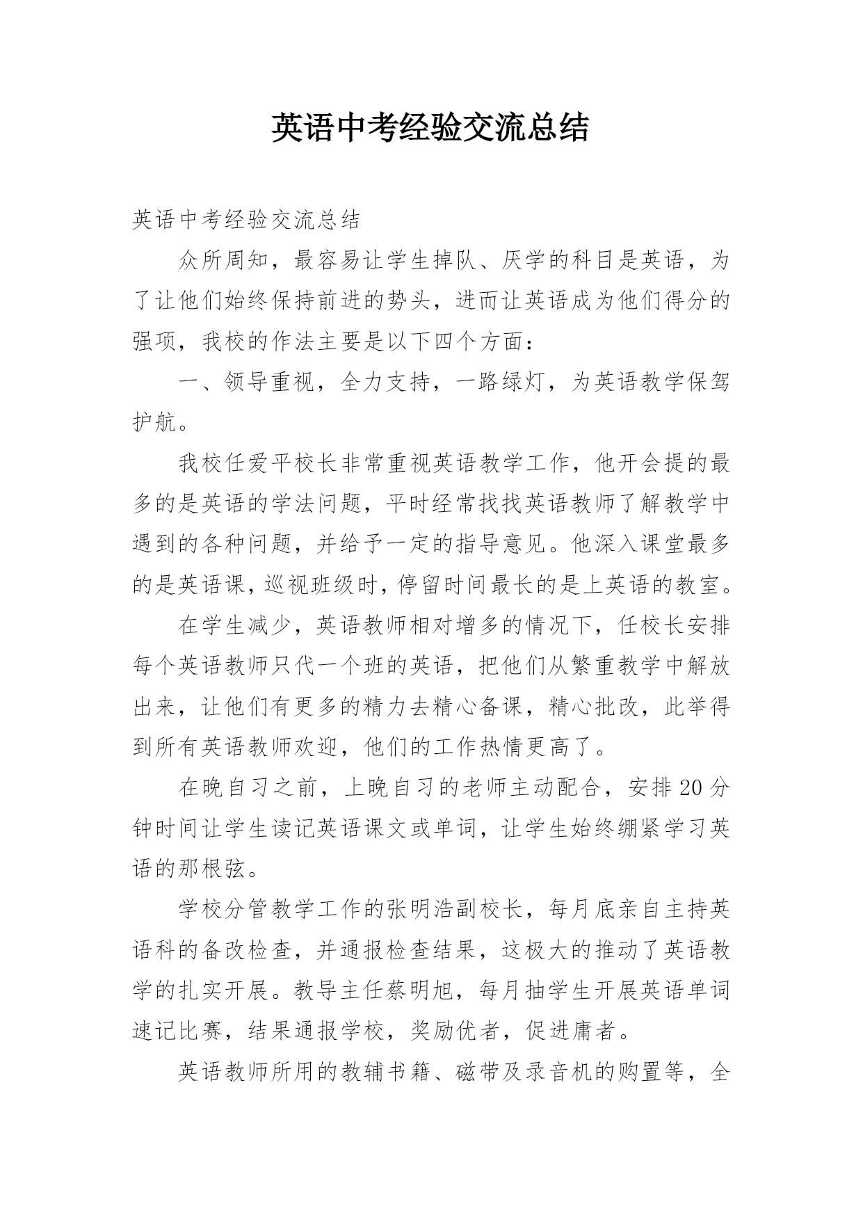 英语中考经验交流总结英语中考经验交流总结众所周知,最容易让学生掉队、厌学的科目是英语,为了让他们始终保持前进的势头,进而让英语成为他们得分的强项,我校的作法主要是以下四个方面:一、领导重视,全力支持,一路绿灯,为英语教学保驾护航。我校任爱平校长非常重视英语教学工作,他开会提的最多的是英语的学法问题,平时经常找找英语教师了解教学中遇到的各种问题,并给予一定的指导意见。他深入课堂最多的是英语课,巡视班级时,停留时间最长的是上英语的教室。在学生减少,英语教师相对增多的情况下,任校长安排每个英语教师只代一个班的英