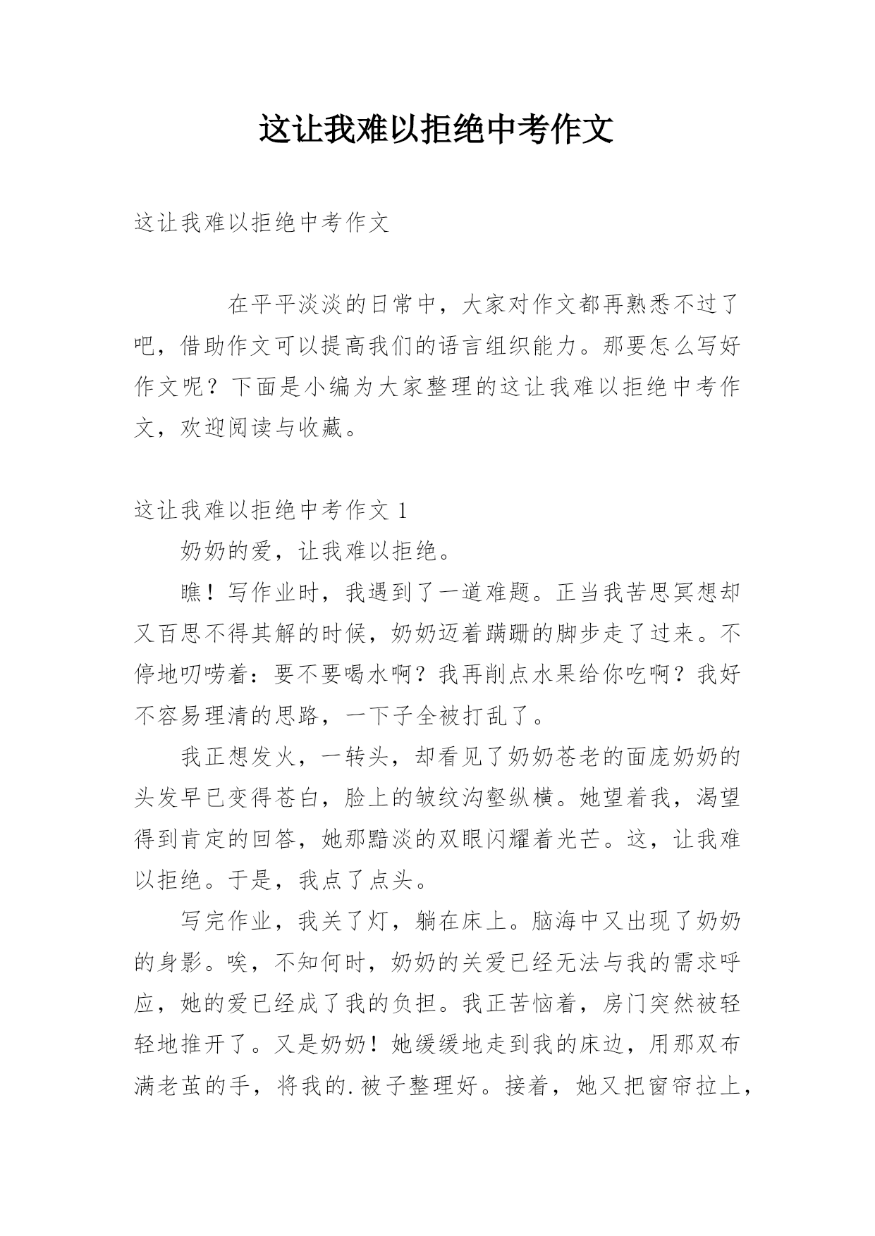 这让我难以拒绝中考作文这让我难以拒绝中考作文在平平淡淡的日常中,大家对作文都再熟悉不过了吧,借助作文可以提高我们的语言组织能力。那要怎么写好作文呢?下面是小编为大家整理的这让我难以拒绝中考作文,欢迎阅读与收藏。这让我难以拒绝中考作文1奶奶的爱,让我难以拒绝。瞧!写作业时,我遇到了一道难题。正当我苦思冥想却又百思不得其解的时候,奶奶迈着蹒跚的脚步走了过来。不停地叨唠着:要不要喝水啊?我再削点水果给你吃啊?我好不容易理清的思路,一下子全被打乱了。我正想发火,一转头,却看见了奶奶苍老的面庞奶奶的头发早已变得苍白