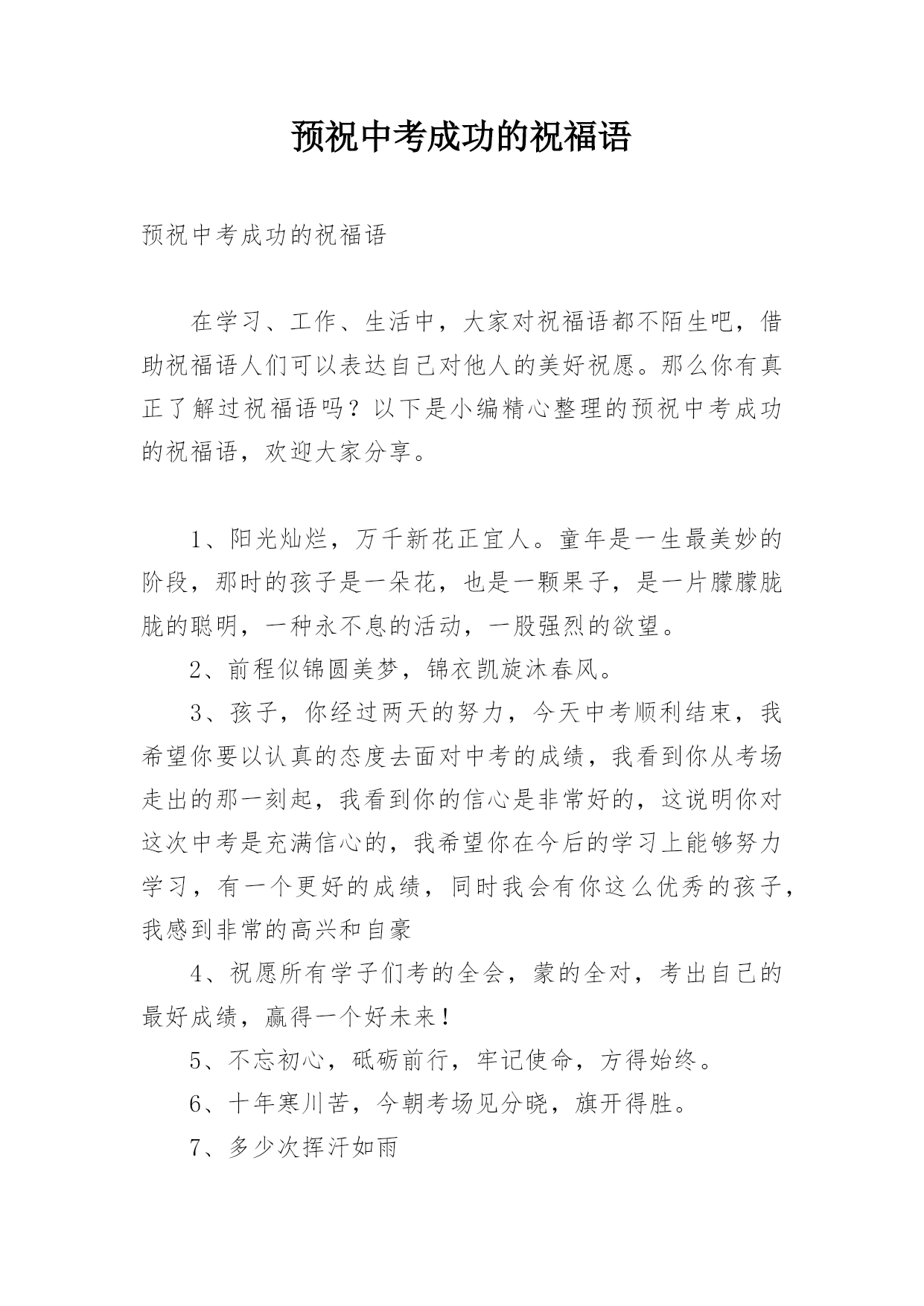 预祝中考成功的祝福语预祝中考成功的祝福语在学习、工作、生活中,大家对祝福语都不陌生吧,借助祝福语人们可以表达自己对他人的美好祝愿。那么你有真正了解过祝福语吗?以下是小编精心整理的预祝中考成功的祝福语,欢迎大家分享。1、阳光灿烂,万千新花正宜人。童年是一生最美妙的阶段,那时的孩子是一朵花,也是一颗果子,是一片朦朦胧胧的聪明,一种永不息的活动,一股强烈的欲望。2、前程似锦圆美梦,锦衣凯旋沐春风。3、孩子,你经过两天的努力,今天中考顺利结束,我希望你要以认真的态度去面对中考的成绩,我看到你从考场走出的那一刻起,