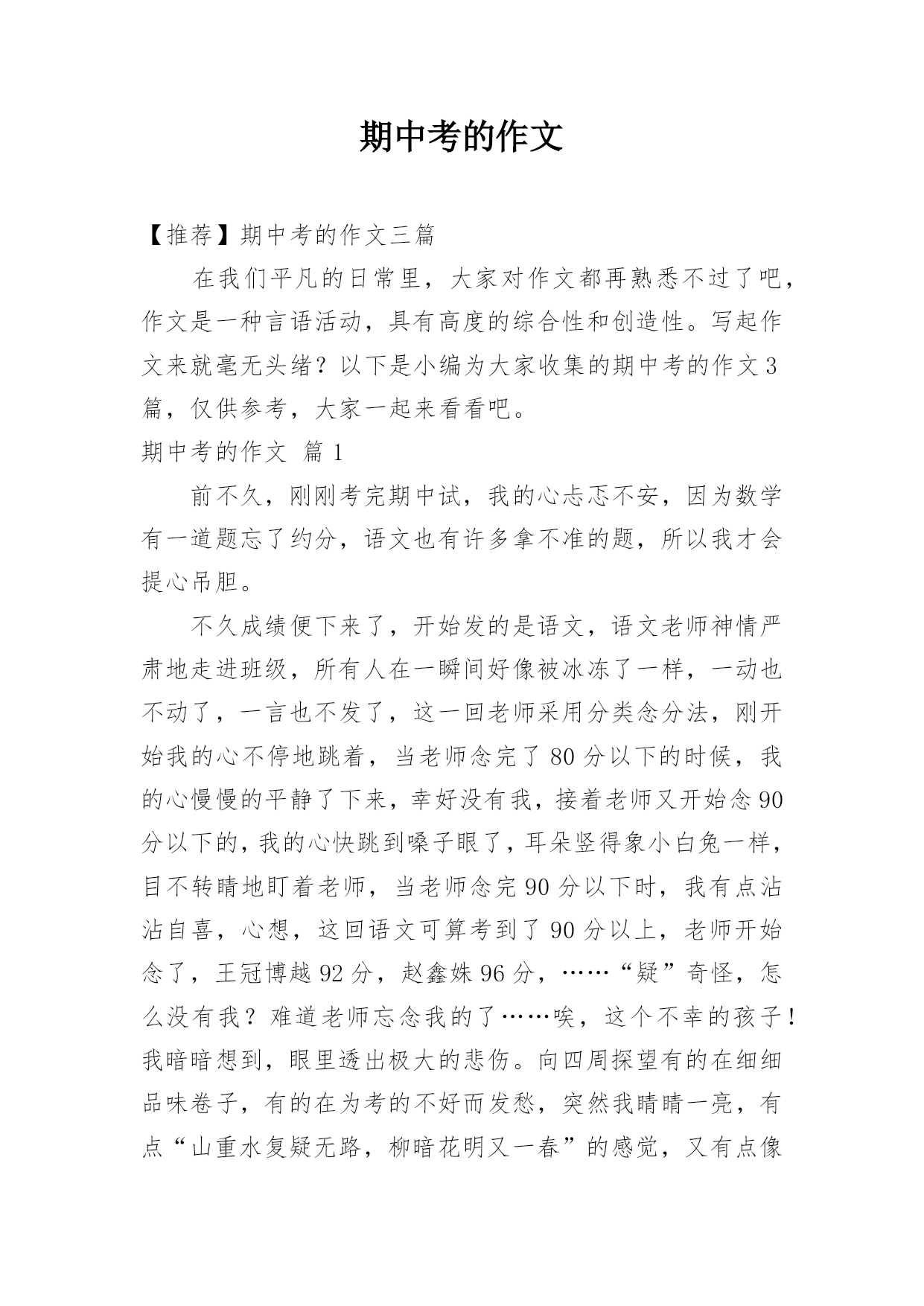 期中考的作文【推荐】期中考的作文三篇在我们平凡的日常里,大家对作文都再熟悉不过了吧,作文是一种言语活动,具有高度的综合性和创造性。写起作文来就毫无头绪?以下是小编为大家收集的期中考的作文3篇,仅供参考,大家一起来看看吧。期中考的作文篇1前不久,刚刚考完期中试,我的心忐忑不安,因为数学有一道题忘了约分,语文也有许多拿不准的题,所以我才会提心吊胆。不久成绩便下来了,开始发的是语文,语文老师神情严肃地走进班级,所有人在一瞬间好像被冰冻了一样,一动也不动了,一言也不发了,这一回老师采用分类念分法,刚开始我的心不停