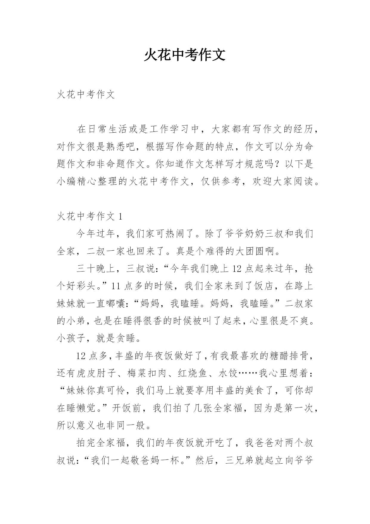 火花中考作文火花中考作文在日常生活或是工作学习中,大家都有写作文的经历,对作文很是熟悉吧,根据写作命题的特点,作文可以分为命题作文和非命题作文。你知道作文怎样写才规范吗?以下是小编精心整理的火花中考作文,仅供参考,欢迎大家阅读。火花中考作文1今年过年,我们家可热闹了。除了爷爷奶奶三叔和我们全家,二叔一家也回来了。真是个难得的大团圆啊。三十晚上,三叔说:“今年我们晚上12点起来过年,抢个好彩头。”11点多的时候,我们全家来到了饭店,在路上妹妹就一直嘟囔:“妈妈,我瞌睡。妈妈,我瞌睡。”二叔家的小弟,也是在睡