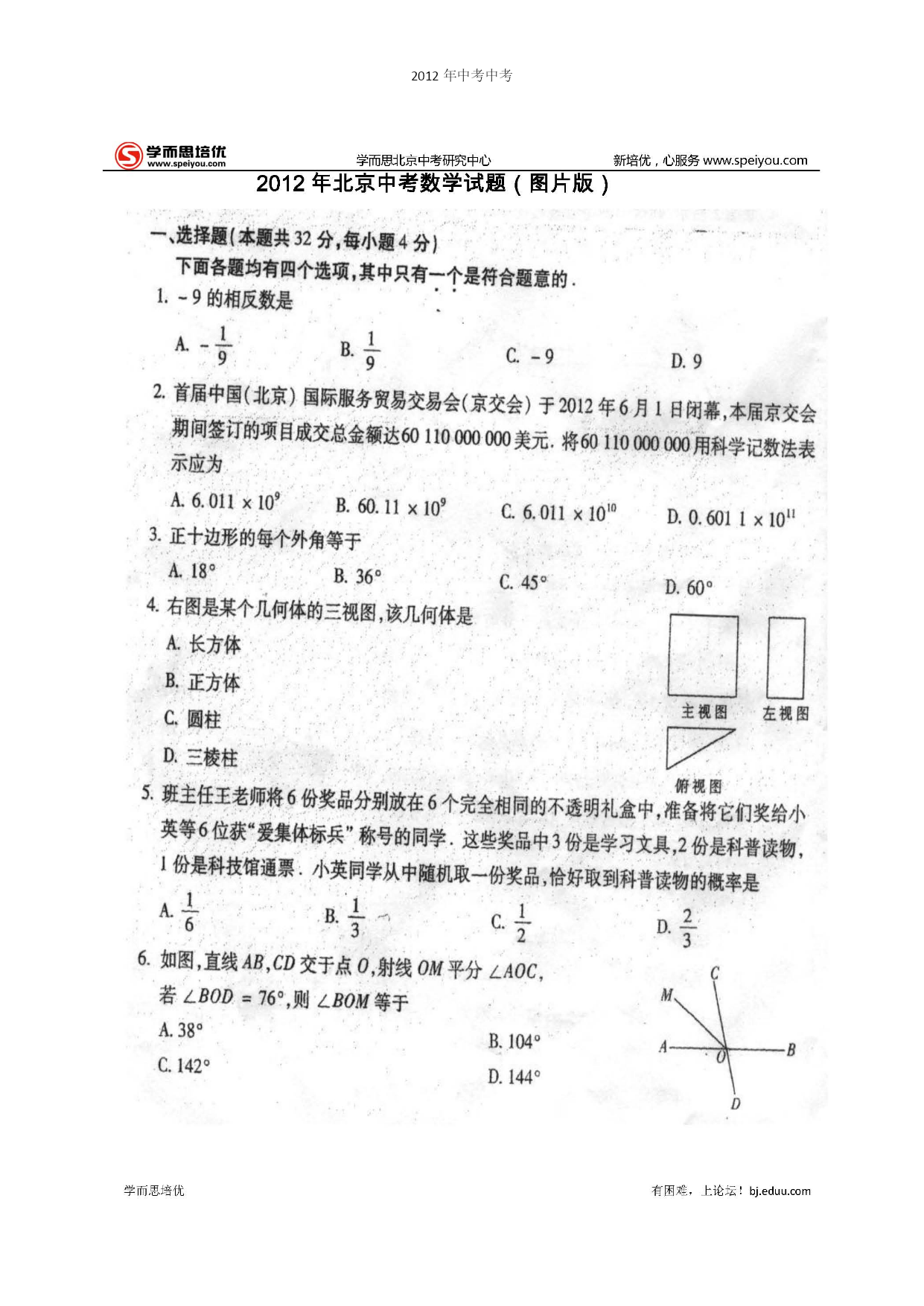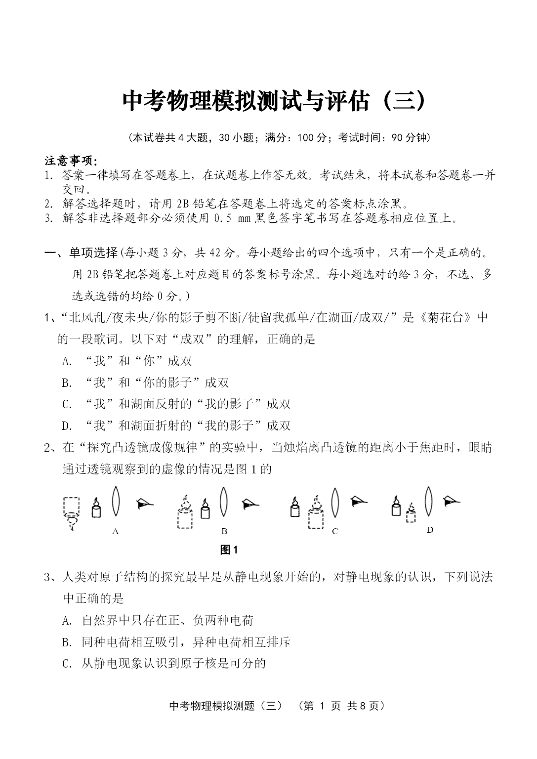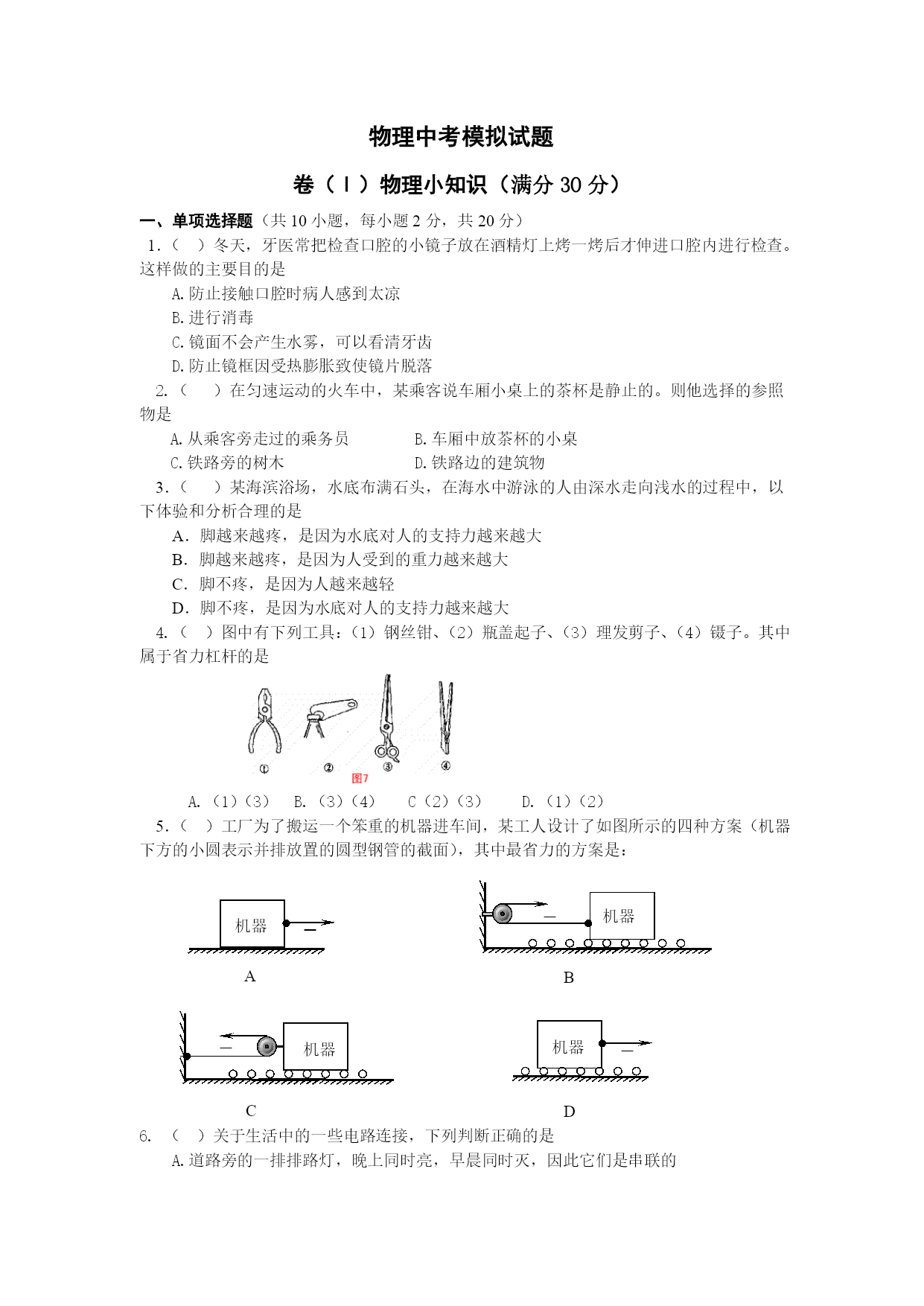 物理中考模拟试题卷(Ⅰ)物理小知识(满分30分)一、单项选择题(共10小题,每小题2分,共20分)1.()冬天,牙医常把检查口腔的小镜子放在酒精灯上烤一烤后才伸进口腔内进行检查。这样做的主要目的是A.防止接触口腔时病人感到太凉B.进行消毒C.镜面不会产生水雾,可以看清牙齿D.防止镜框因受热膨胀致使镜片脱落2.()在匀速运动的火车中,某乘客说车厢小桌上的茶杯是静止的。则他选择的参照物是A.从乘客旁走过的乘务员B.车厢中放茶杯的小桌C.铁路旁的树木D.铁路边的建筑物3.()某海滨浴场,水底布满石头,在海水中游