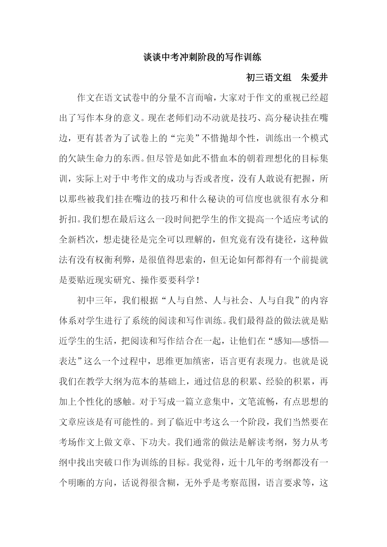 谈谈中考冲刺阶段的写作训练初三语文组朱爱井作文在语文试卷中的分量不言而喻,大家对于作文的重视已经超出了写作本身的意义。现在老师们动不动就是技巧、高分秘诀挂在嘴边,更有甚者为了试卷上的“完美”不惜抛却个性,训练出一个模式的欠缺生命力的东西。但尽管是如此不惜血本的朝着理想化的目标集训,实际上对于中考作文的成功与否或者度,没有人敢说有把握,所以那些被我们挂在嘴边的技巧和什么秘诀的可信度也就很有水分和折扣。我们想在最后这么一段时间把学生的作文提高一个适应考试的全新档次,想走捷径是完全可以理解的,但究竟有没有捷径,
