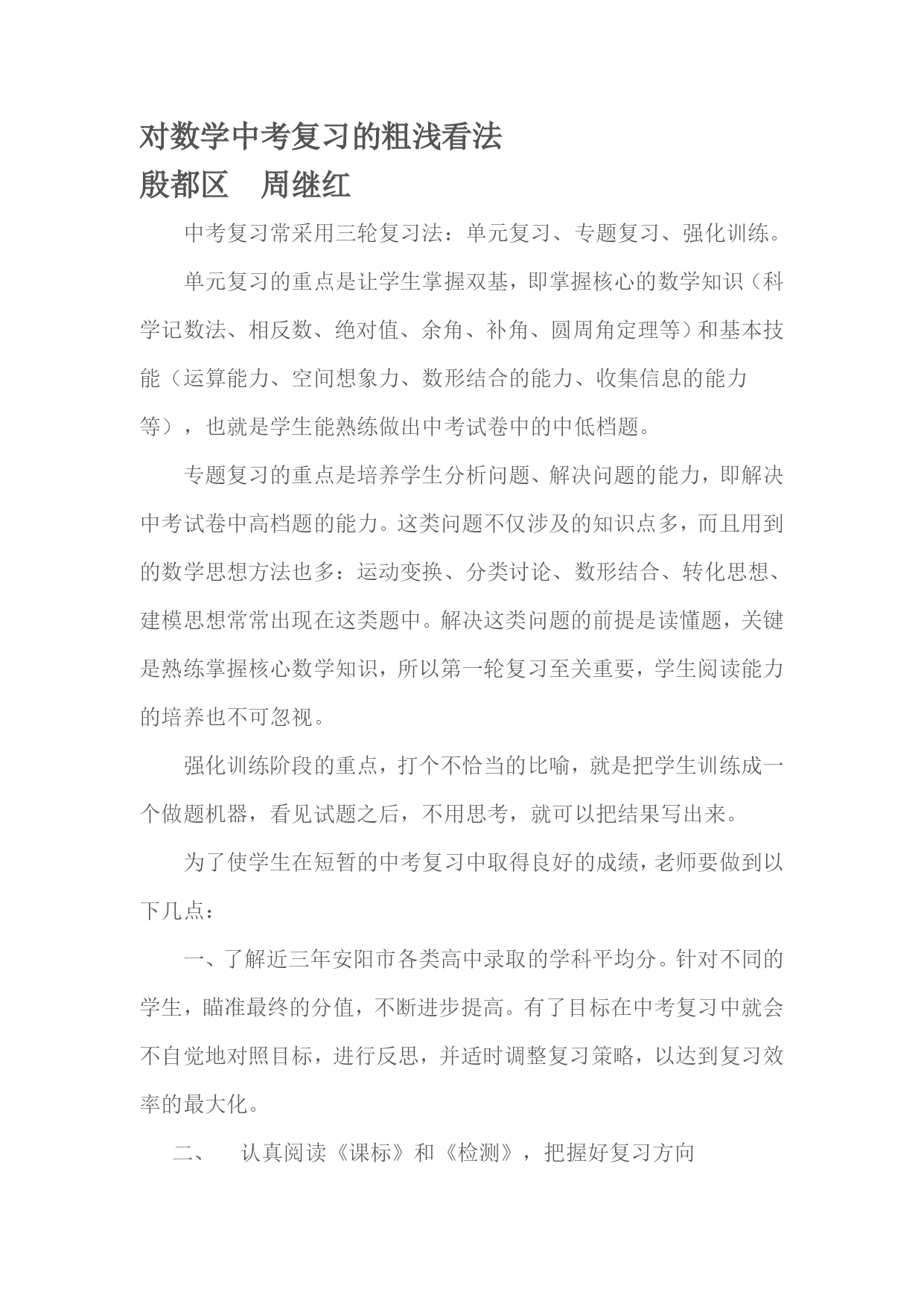 对数学中考复习的粗浅看法殷都区周继红中考复习常采用三轮复习法:单元复习、专题复习、强化训练。单元复习的重点是让学生掌握双基,即掌握核心的数学知识(科学记数法、相反数、绝对值、余角、补角、圆周角定理等)和基本技能(运算能力、空间想象力、数形结合的能力、收集信息的能力等),也就是学生能熟练做出中考试卷中的中低档题。专题复习的重点是培养学生分析问题、解决问题的能力,即解决中考试卷中高档题的能力。这类问题不仅涉及的知识点多,而且用到的数学思想方法也多:运动变换、分类讨论、数形结合、转化思想、建模思想常常出现在这类