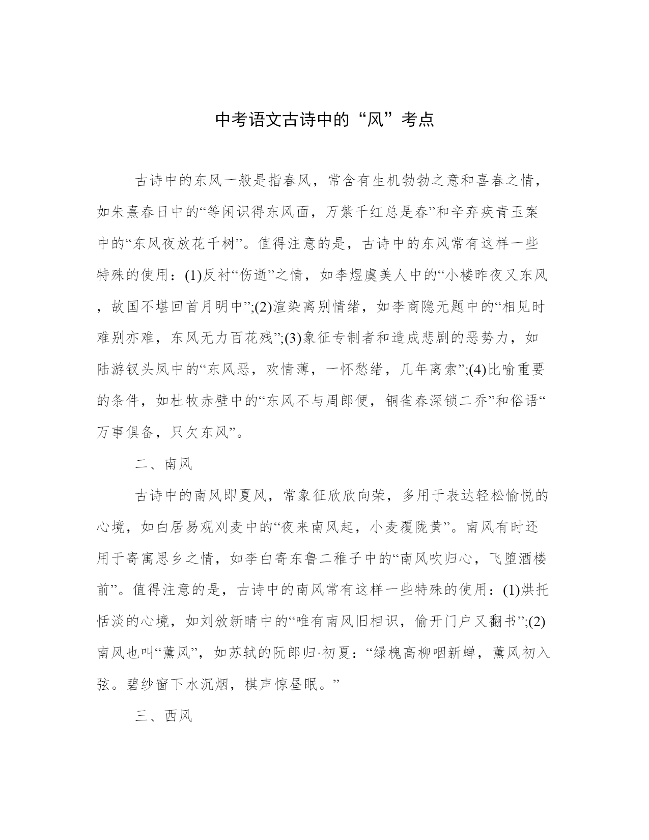中考语文古诗中的“风”考点古诗中的东风一般是指春风,常含有生机勃勃之意和喜春之情,如朱熹春日中的“等闲识得东风面,万紫千红总是春”和辛弃疾青玉案中的“东风夜放花千树”。值得注意的是,古诗中的东风常有这样一些特殊的使用:(1)反衬“伤逝”之情,如李煜虞美人中的“小楼昨夜又东风,故国不堪回首月明中”;(2)渲染离别情绪,如李商隐无题中的“相见时难别亦难,东风无力百花残”;(3)象征专制者和造成悲剧的恶势力,如陆游钗头凤中的“东风恶,欢情薄,一怀愁绪,几年离索”;(4)比喻重要的条件,如杜牧赤壁中的“东风不与周