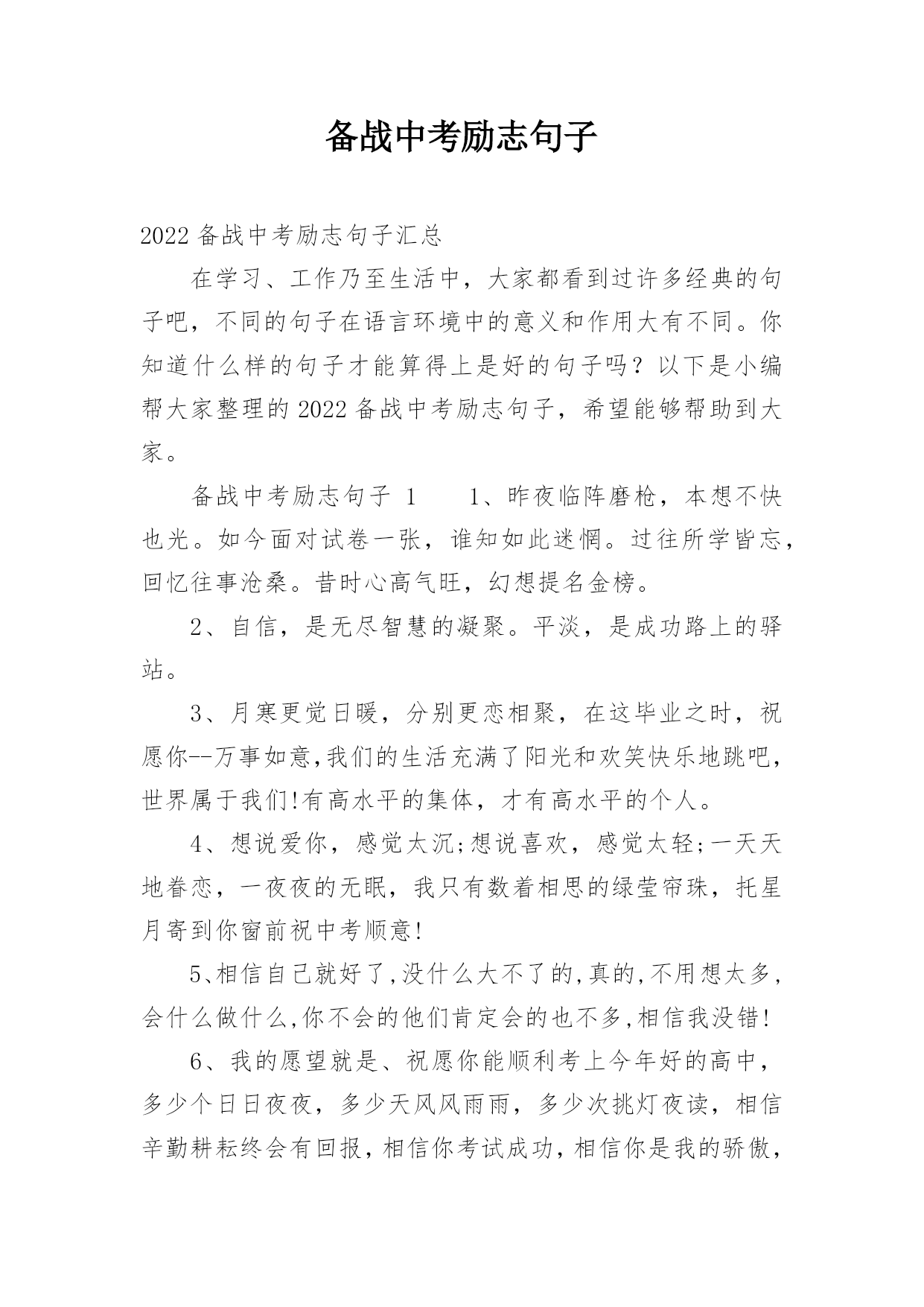 备战中考励志句子2022备战中考励志句子汇总在学习、工作乃至生活中,大家都看到过许多经典的句子吧,不同的句子在语言环境中的意义和作用大有不同。你知道什么样的句子才能算得上是好的句子吗?以下是小编帮大家整理的2022备战中考励志句子,希望能够帮助到大家。备战中考励志句子11、昨夜临阵磨枪,本想不快也光。如今面对试卷一张,谁知如此迷惘。过往所学皆忘,回忆往事沧桑。昔时心高气旺,幻想提名金榜。2、自信,是无尽智慧的凝聚。平淡,是成功路上的驿站。3、月寒更觉日暖,分别更恋相聚,在这毕业之时,祝愿你--万事如意,我