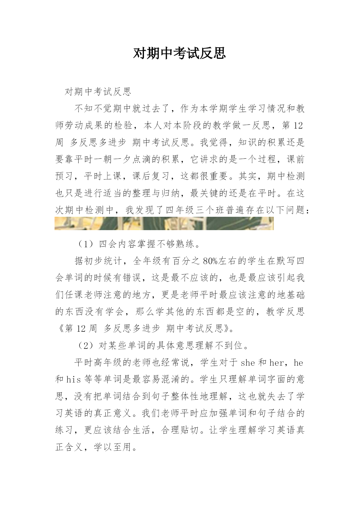 对期中考试反思对期中考试反思不知不觉期中就过去了,作为本学期学生学习情况和教师劳动成果的检验,本人对本阶段的教学做一反思,第12周多反思多进步期中考试反思。我觉得,知识的积累还是要靠平时一朝一夕点滴的积累,它讲求的是一个过程,课前预习,平时上课,课后复习,这都很重要。其实,期中检测也只是进行适当的整理与归纳,最关键的还是在平时。在这次期中检测中,我发现了四年级三个班普遍存在以下问题:(1)四会内容掌握不够熟练。据初步统计,全年级有百分之80%左右的学生在默写四会单词的时候有错误,这是最不应该的,也是最应该