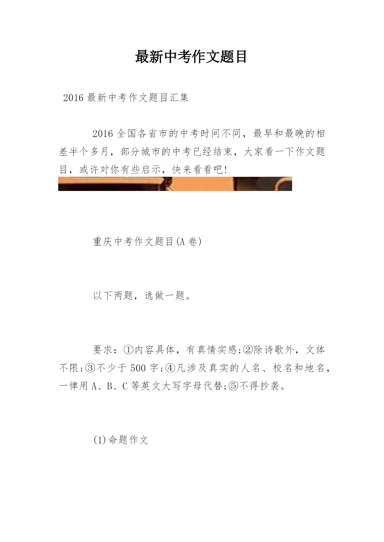 最新中考作文题目2016最新中考作文题目汇集2016全国各省市的中考时间不同,最早和最晚的相差半个多月,部分城市的中考已经结束,大家看一下作文题目,或许对你有些启示,快来看看吧!重庆中考作文题目(A卷)以下两题,选做一题。要求:①内容具体,有真情实感;②除诗歌外,文体不限;③不少于500字;④凡涉及真实的人名、校名和地名,一律用A、B、C等英文大写字母代替;⑤不得抄袭。(1)命题作文人生就像是一条路,漫长而曲折。走过平坦的大道,能感受到一路顺风的畅快;走过崎岖的小路,能感受跋山涉水的艰难。虽有苦有甜,但我