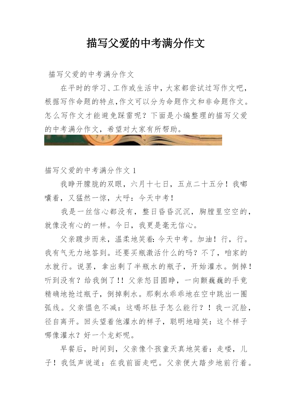 描写父爱的中考满分作文描写父爱的中考满分作文在平时的学习、工作或生活中,大家都尝试过写作文吧,根据写作命题的特点,作文可以分为命题作文和非命题作文。怎么写作文才能避免踩雷呢?下面是小编整理的描写父爱的中考满分作文,希望对大家有所帮助。描写父爱的中考满分作文1我睁开朦胧的双眼,六月十七日,五点二十五分!我嘟囔着,又猛然一惊,大呼:今天中考!我是一丝信心都没有,整日昏昏沉沉,胸膛里空空的,就像没有心的一样。今日,我更是毫无信心。父亲踱步而来,温柔地笑着:今天中考。加油!行,行。我有气无力地答到。还要买瓶激活什