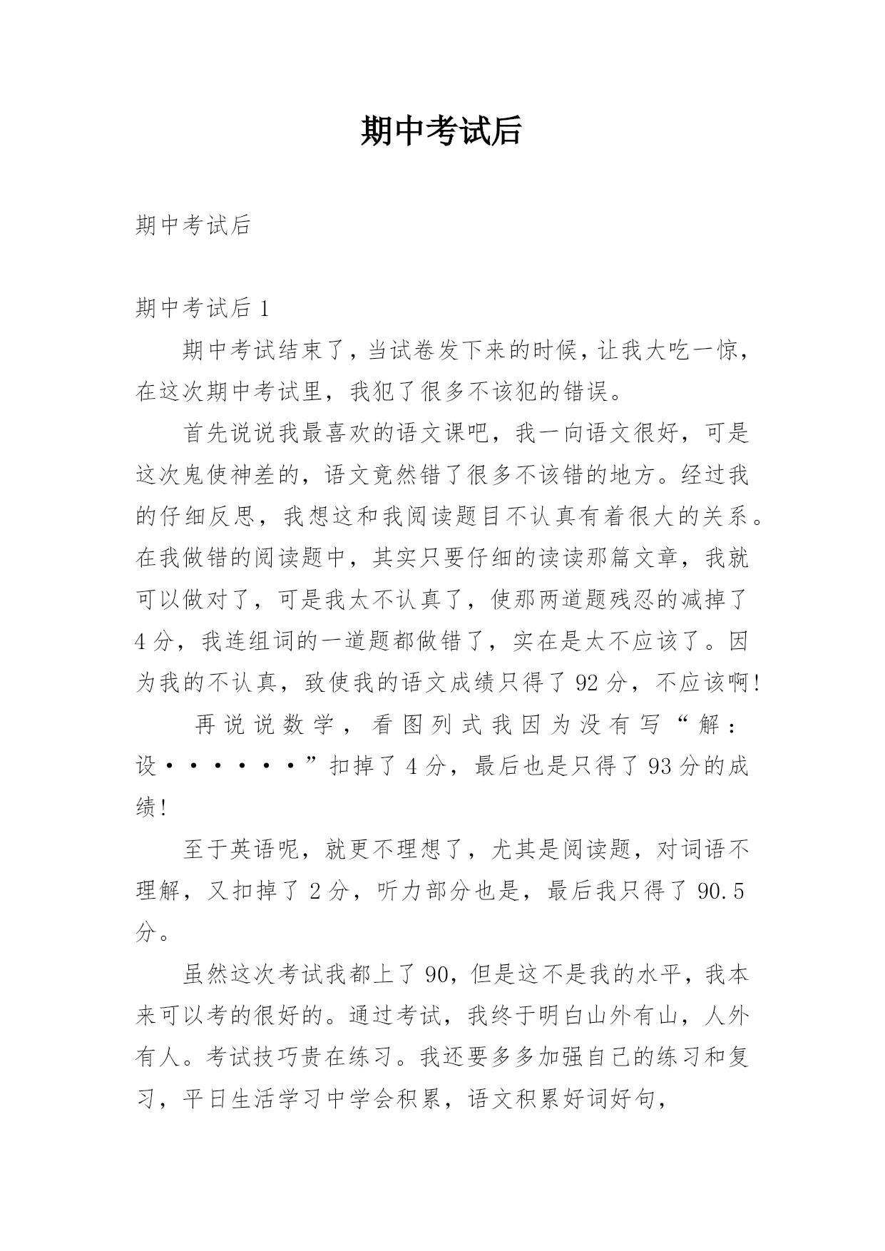 期中考试后期中考试后期中考试后1期中考试结束了,当试卷发下来的时候,让我大吃一惊,在这次期中考试里,我犯了很多不该犯的错误。首先说说我最喜欢的语文课吧,我一向语文很好,可是这次鬼使神差的,语文竟然错了很多不该错的地方。经过我的仔细反思,我想这和我阅读题目不认真有着很大的关系。在我做错的阅读题中,其实只要仔细的读读那篇文章,我就可以做对了,可是我太不认真了,使那两道题残忍的减掉了4分,我连组词的一道题都做错了,实在是太不应该了。因为我的不认真,致使我的语文成绩只得了92分,不应该啊!再说说数学,看图列式我因