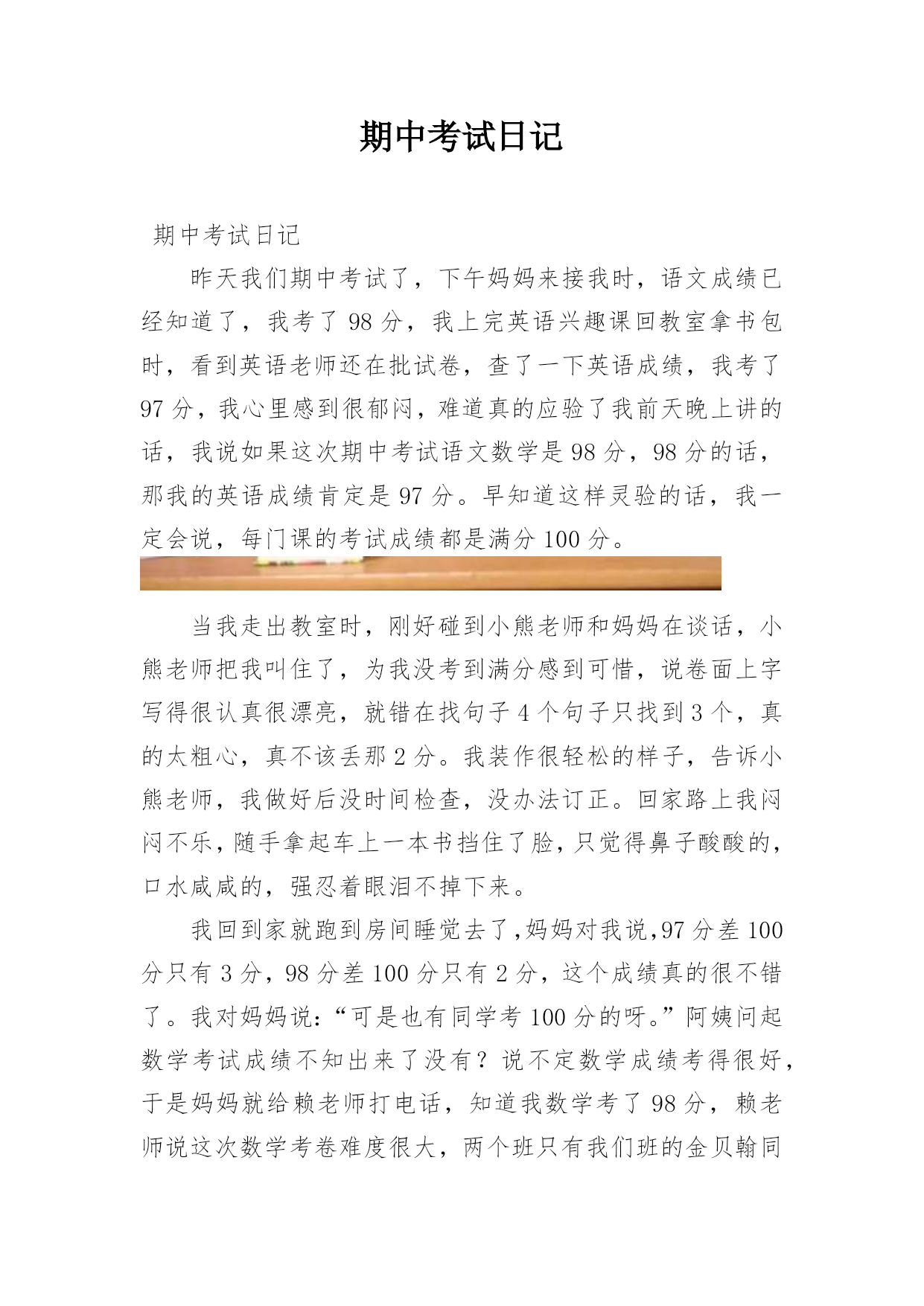 期中考试日记期中考试日记昨天我们期中考试了,下午妈妈来接我时,语文成绩已经知道了,我考了98分,我上完英语兴趣课回教室拿书包时,看到英语老师还在批试卷,查了一下英语成绩,我考了97分,我心里感到很郁闷,难道真的应验了我前天晚上讲的话,我说如果这次期中考试语文数学是98分,98分的话,那我的英语成绩肯定是97分。早知道这样灵验的话,我一定会说,每门课的考试成绩都是满分100分。当我走出教室时,刚好碰到小熊老师和妈妈在谈话,小熊老师把我叫住了,为我没考到满分感到可惜,说卷面上字写得很认真很漂亮,就错在找句子4