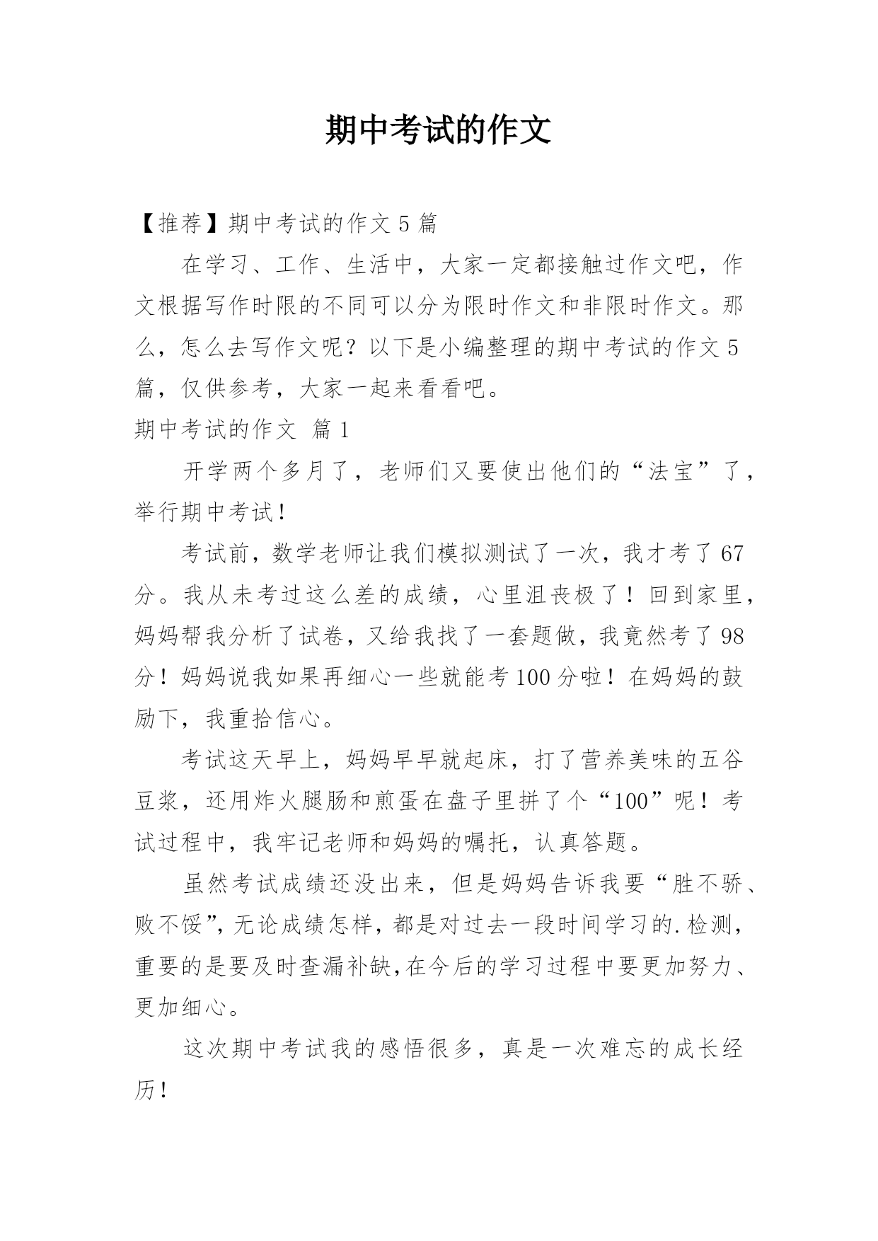 期中考试的作文【推荐】期中考试的作文5篇在学习、工作、生活中,大家一定都接触过作文吧,作文根据写作时限的不同可以分为限时作文和非限时作文。那么,怎么去写作文呢?以下是小编整理的期中考试的作文5篇,仅供参考,大家一起来看看吧。期中考试的作文篇1开学两个多月了,老师们又要使出他们的“法宝”了,举行期中考试!考试前,数学老师让我们模拟测试了一次,我才考了67分。我从未考过这么差的成绩,心里沮丧极了!回到家里,妈妈帮我分析了试卷,又给我找了一套题做,我竟然考了98分!妈妈说我如果再细心一些就能考100分啦!在妈妈