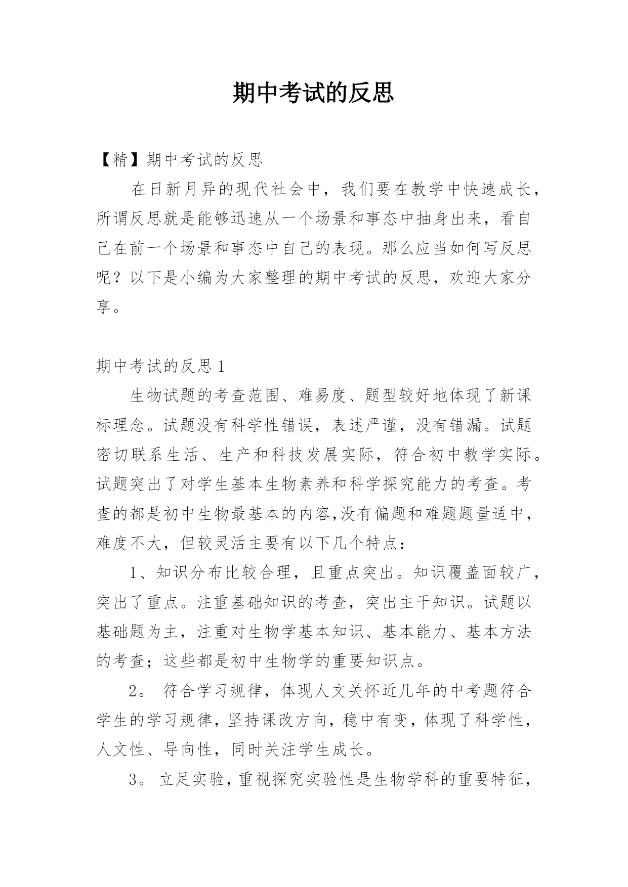 期中考试的反思【精】期中考试的反思在日新月异的现代社会中,我们要在教学中快速成长,所谓反思就是能够迅速从一个场景和事态中抽身出来,看自己在前一个场景和事态中自己的表现。那么应当如何写反思呢?以下是小编为大家整理的期中考试的反思,欢迎大家分享。期中考试的反思1生物试题的考查范围、难易度、题型较好地体现了新课标理念。试题没有科学性错误,表述严谨,没有错漏。试题密切联系生活、生产和科技发展实际,符合初中教学实际。试题突出了对学生基本生物素养和科学探究能力的考查。考查的都是初中生物最基本的内容,没有偏题和难题题量