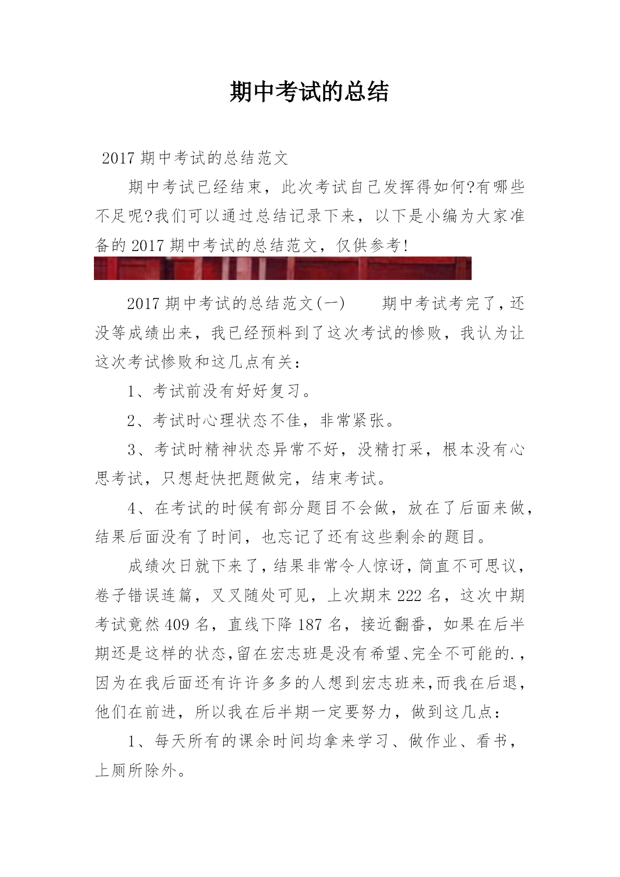 期中考试的总结2017期中考试的总结范文期中考试已经结束,此次考试自己发挥得如何?有哪些不足呢?我们可以通过总结记录下来,以下是小编为大家准备的2017期中考试的总结范文,仅供参考!2017期中考试的总结范文(一)期中考试考完了,还没等成绩出来,我已经预料到了这次考试的惨败,我认为让这次考试惨败和这几点有关:1、考试前没有好好复习。2、考试时心理状态不佳,非常紧张。3、考试时精神状态异常不好,没精打采,根本没有心思考试,只想赶快把题做完,结束考试。4、在考试的时候有部分题目不会做,放在了后面来做,结果后面