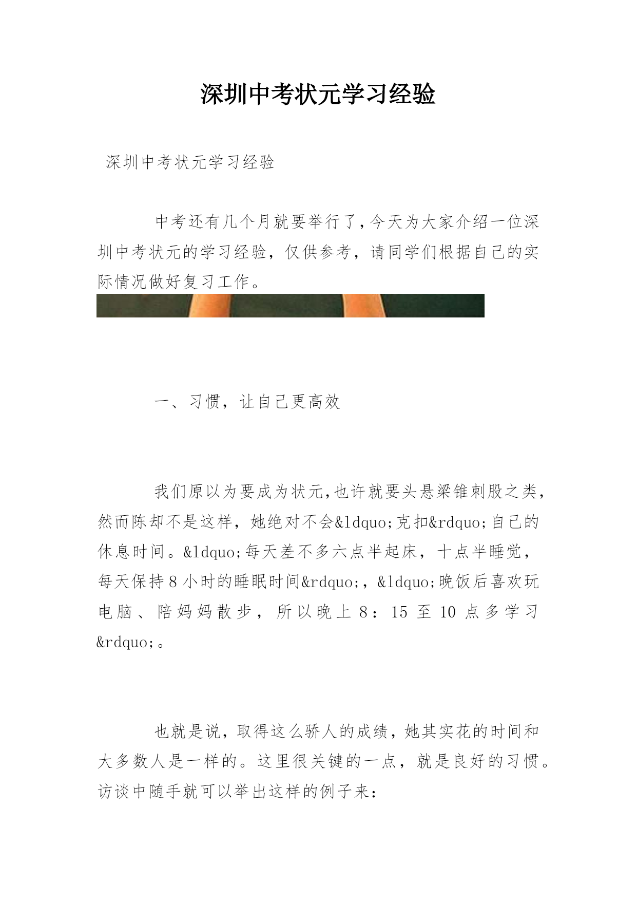 深圳中考状元学习经验深圳中考状元学习经验中考还有几个月就要举行了,今天为大家介绍一位深圳中考状元的学习经验,仅供参考,请同学们根据自己的实际情况做好复习工作。一、习惯,让自己更高效我们原以为要成为状元,也许就要头悬梁锥刺股之类,然而陈却不是这样,她绝对不会“克扣”自己的休息时间。“每天差不多六点半起床,十点半睡觉,每天保持8小时的睡眠时间”,“晚饭后喜欢玩电脑、陪妈妈散步,所以晚上8:15至10点多学习”。也就是说,取得这么骄人的成绩