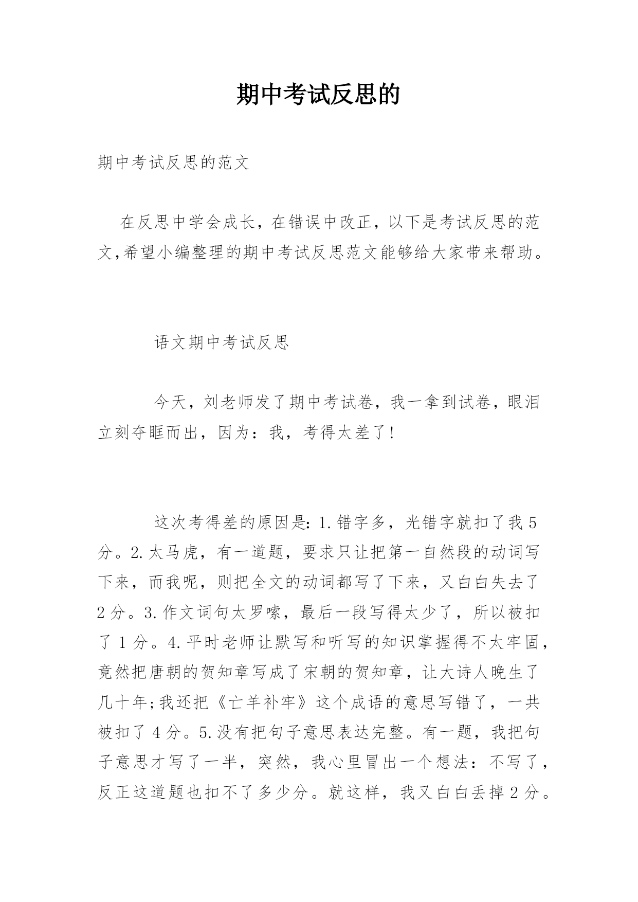 期中考试反思的期中考试反思的范文在反思中学会成长,在错误中改正,以下是考试反思的范文,希望小编整理的期中考试反思范文能够给大家带来帮助。语文期中考试反思今天,刘老师发了期中考试卷,我一拿到试卷,眼泪立刻夺眶而出,因为:我,考得太差了!这次考得差的原因是:1.错字多,光错字就扣了我5分。2.太马虎,有一道题,要求只让把第一自然段的动词写下来,而我呢,则把全文的动词都写了下来,又白白失去了2分。3.作文词句太罗嗦,最后一段写得太少了,所以被扣了1分。4.平时老师让默写和听写的知识掌握得不太牢固,竟然把唐朝的贺