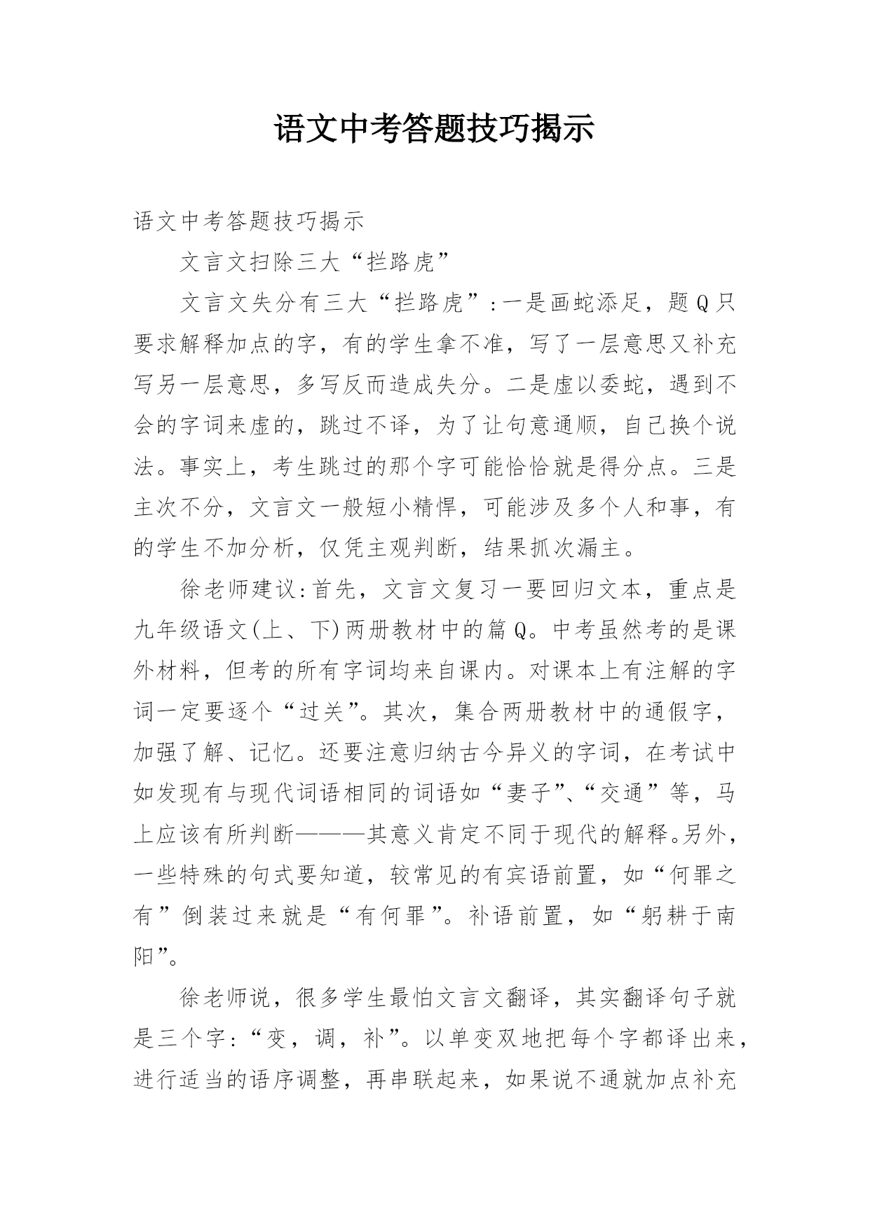 语文中考答题技巧揭示语文中考答题技巧揭示文言文扫除三大“拦路虎”文言文失分有三大“拦路虎”:一是画蛇添足,题Q只要求解释加点的字,有的学生拿不准,写了一层意思又补充写另一层意思,多写反而造成失分。二是虚以委蛇,遇到不会的字词来虚的,跳过不译,为了让句意通顺,自己换个说法。事实上,考生跳过的那个字可能恰恰就是得分点。三是主次不分,文言文一般短小精悍,可能涉及多个人和事,有的学生不加分析,仅凭主观判断,结果抓次漏主。徐老师建议:首先,文言文复习一要回归文本,重点是九年级语文(上、下)两册教材中的篇Q。中考虽然