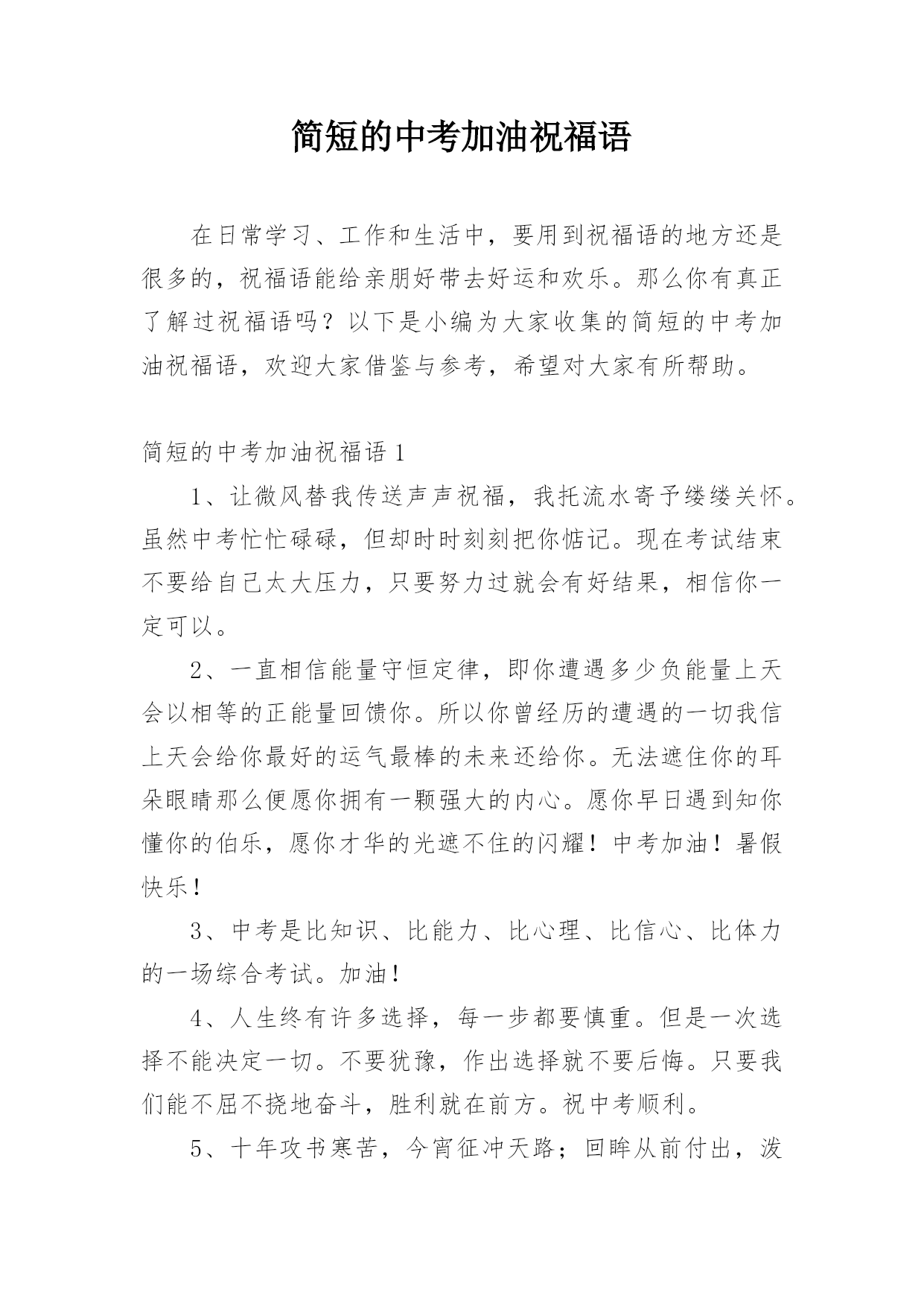 简短的中考加油祝福语在日常学习、工作和生活中,要用到祝福语的地方还是很多的,祝福语能给亲朋好带去好运和欢乐。那么你有真正了解过祝福语吗?以下是小编为大家收集的简短的中考加油祝福语,欢迎大家借鉴与参考,希望对大家有所帮助。简短的中考加油祝福语11、让微风替我传送声声祝福,我托流水寄予缕缕关怀。虽然中考忙忙碌碌,但却时时刻刻把你惦记。现在考试结束不要给自己太大压力,只要努力过就会有好结果,相信你一定可以。2、一直相信能量守恒定律,即你遭遇多少负能量上天会以相等的正能量回馈你。所以你曾经历的遭遇的一切我信上天会