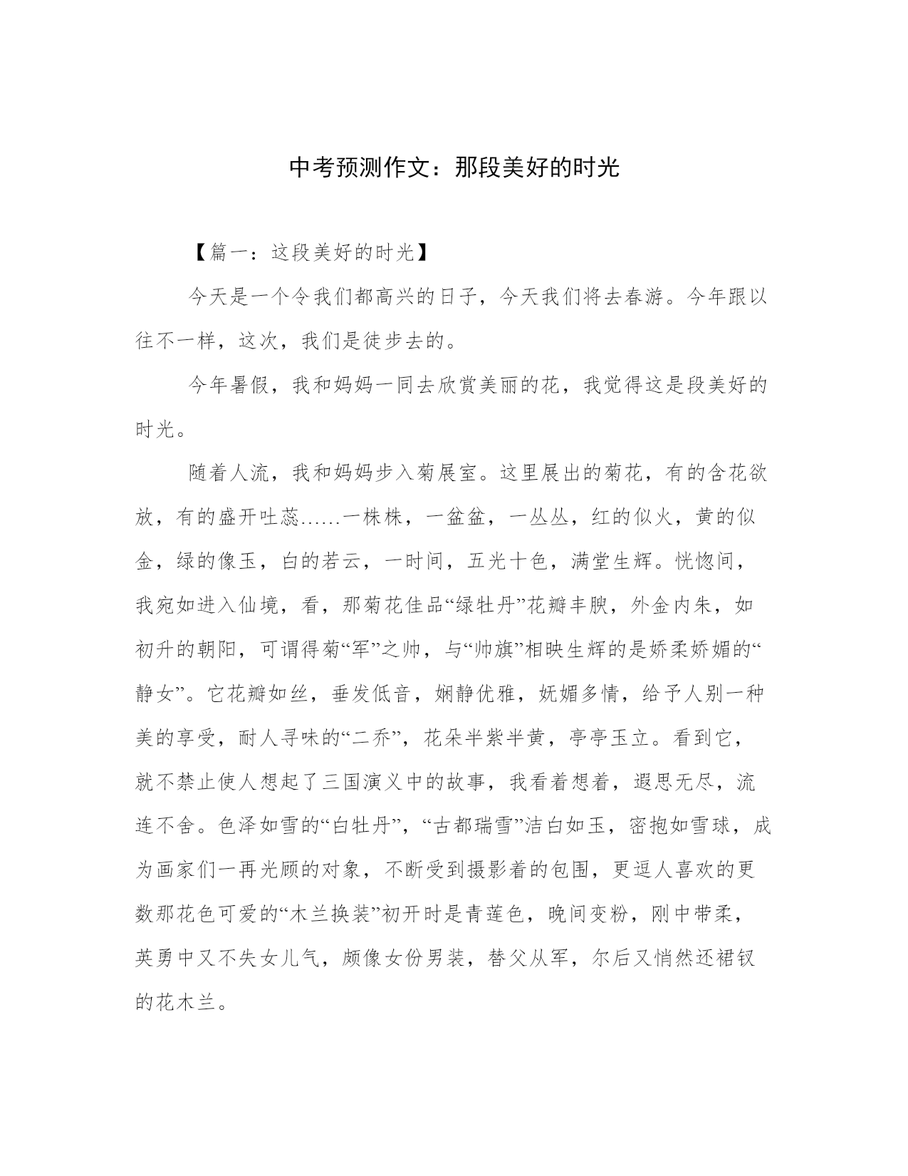 中考预测作文:那段美好的时光【篇一:这段美好的时光】今天是一个令我们都高兴的日子,今天我们将去春游。今年跟以往不一样,这次,我们是徒步去的。今年暑假,我和妈妈一同去欣赏美丽的花,我觉得这是段美好的时光。随着人流,我和妈妈步入菊展室。这里展出的菊花,有的含花欲放,有的盛开吐蕊……一株株,一盆盆,一丛丛,红的似火,黄的似金,绿的像玉,白的若云,一时间,五光十色,满堂生辉。恍惚间,我宛如进入仙境,看,那菊花佳品“绿牡丹”花瓣丰腴,外金内朱,如初升的朝阳,可谓得菊“军”之帅,与“帅旗”相映生辉的是娇柔娇媚的“静女