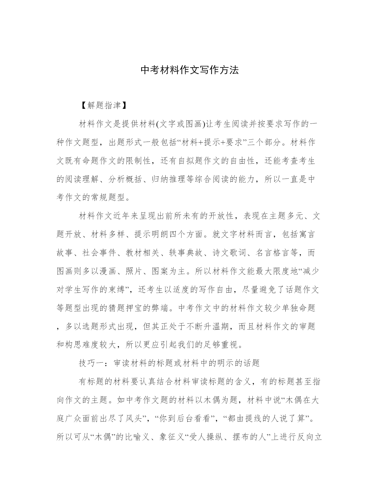 中考材料作文写作方法【解题指津】材料作文是提供材料(文字或图画)让考生阅读并按要求写作的一种作文题型,出题形式一般包括“材料+提示+要求”三个部分。材料作文既有命题作文的限制性,还有自拟题作文的自由性,还能考查考生的阅读理解、分析概括、归纳推理等综合阅读的能力,所以一直是中考作文的常规题型。材料作文近年来呈现出前所未有的开放性,表现在主题多元、文题开放、材料多样、提示明朗四个方面。就文字材料而言,包括寓言故事、社会事件、教材相关、轶事典故、诗文歌词、名言格言等,而图画则多以漫画、照片、图案为主。所以材料作