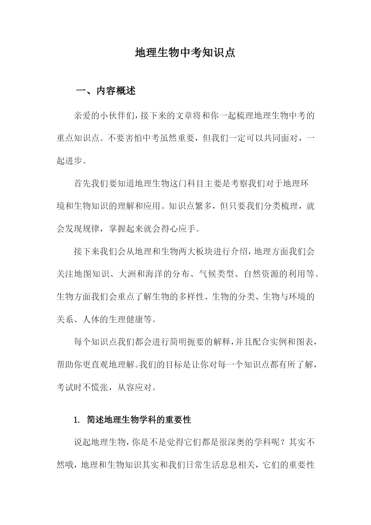 地理生物中考知识点一、内容概述亲爱的小伙伴们,接下来的文章将和你一起梳理地理生物中考的重点知识点。不要害怕中考虽然重要,但我们一定可以共同面对,一起进步。首先我们要知道地理生物这门科目主要是考察我们对于地理环境和生物知识的理解和应用。知识点繁多,但只要我们分类梳理,就会发现规律,掌握起来就会得心应手。接下来我们会从地理和生物两大板块进行介绍,地理方面我们会关注地图知识、大洲和海洋的分布、气候类型、自然资源的利用等。生物方面我们会重点了解生物的多样性、生物的分类、生物与环境的关系、人体的生理健康等。每个知识