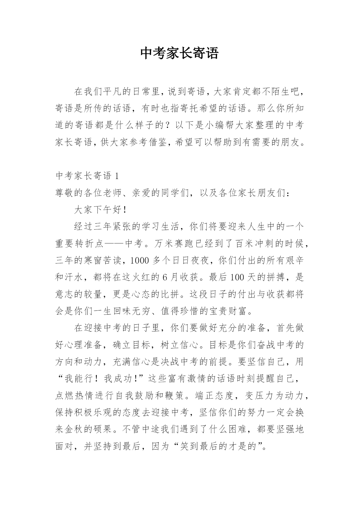 中考家长寄语在我们平凡的日常里,说到寄语,大家肯定都不陌生吧,寄语是所传的话语,有时也指寄托希望的话语。那么你所知道的寄语都是什么样子的?以下是小编帮大家整理的中考家长寄语,供大家参考借鉴,希望可以帮助到有需要的朋友。中考家长寄语1尊敬的各位老师、亲爱的同学们,以及各位家长朋友们:大家下午好!经过三年紧张的学习生活,你们将要迎来人生中的一个重要转折点——中考。万米赛跑已经到了百米冲刺的时候,三年的寒窗苦读,1000多个日日夜夜,你们付出的所有艰辛和汗水,都将在这火红的6月收获。最后100天的拼搏,是意志的