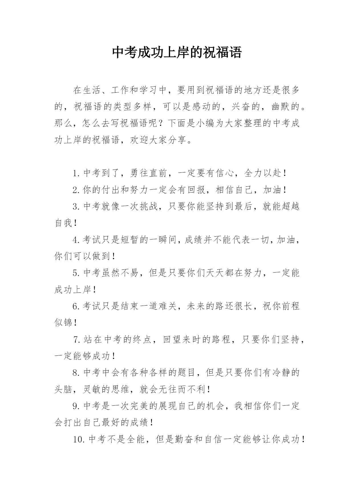 中考成功上岸的祝福语在生活、工作和学习中,要用到祝福语的地方还是很多的,祝福语的类型多样,可以是感动的,兴奋的,幽默的。那么,怎么去写祝福语呢?下面是小编为大家整理的中考成功上岸的祝福语,欢迎大家分享。1.中考到了,勇往直前,一定要有信心,全力以赴!2.你的付出和努力一定会有回报,相信自己,加油!3.中考就像一次挑战,只要你能坚持到最后,就能超越自我!4.考试只是短暂的一瞬间,成绩并不能代表一切,加油,你们可以做到!5.中考虽然不易,但是只要你们天天都在努力,一定能成功上岸!6.考试只是结束一道难关,未来