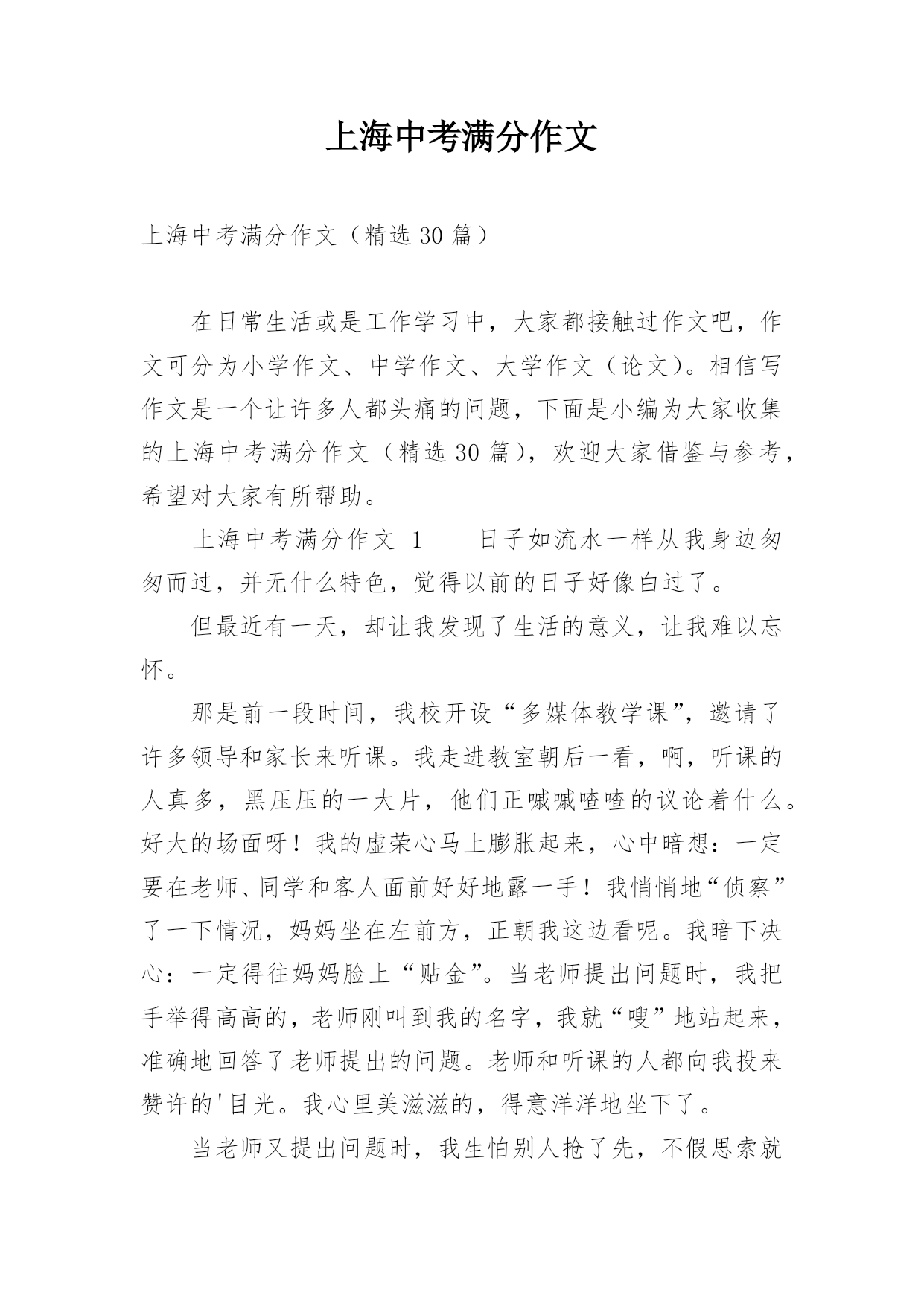 上海中考满分作文上海中考满分作文(精选30篇)在日常生活或是工作学习中,大家都接触过作文吧,作文可分为小学作文、中学作文、大学作文(论文)。相信写作文是一个让许多人都头痛的问题,下面是小编为大家收集的上海中考满分作文(精选30篇),欢迎大家借鉴与参考,希望对大家有所帮助。上海中考满分作文1日子如流水一样从我身边匆匆而过,并无什么特色,觉得以前的日子好像白过了。但最近有一天,却让我发现了生活的意义,让我难以忘怀。那是前一段时间,我校开设“多媒体教学课”,邀请了许多领导和家长来听课。我走进教室朝后一看,啊,听
