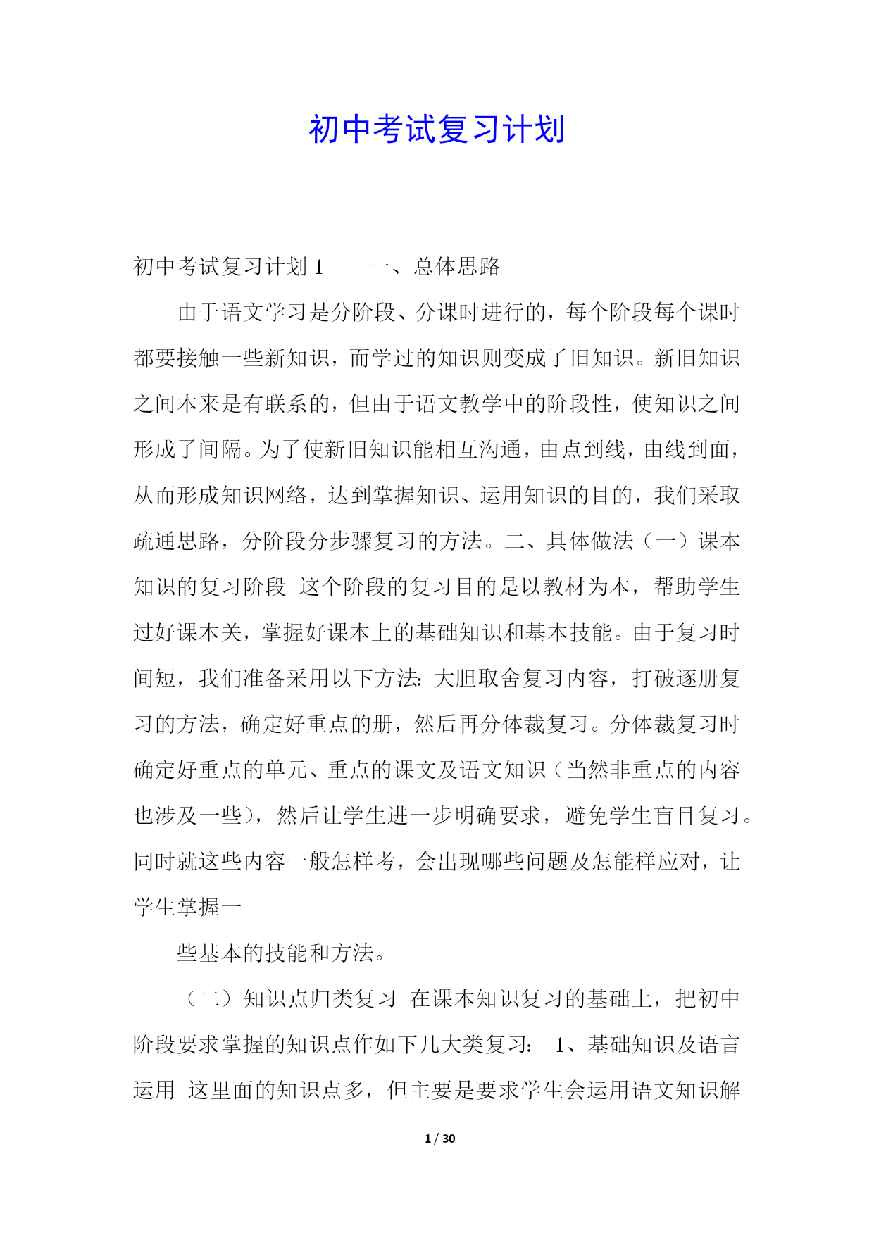 PAGE30/NUMPAGES30初中考试复习计划初中考试复习计划1一、总体思路由于语文学习是分阶段、分课时进行的,每个阶段每个课时都要接触一些新知识,而学过的知识则变成了旧知识。新旧知识之间本来是有联系的,但由于语文教学中的阶段性,使知识之间形成了间隔。为了使新旧知识能相互沟通,由点到线,由线到面,从而形成知识网络,达到掌握知识、运用知识的目的,我们采取疏通思路,分阶段分步骤复习的方法。二、具体做法(一)课本知识的复习阶段这个阶段的复习目的是以教材为本,帮助学生过好课本关,掌握好课本上的基础