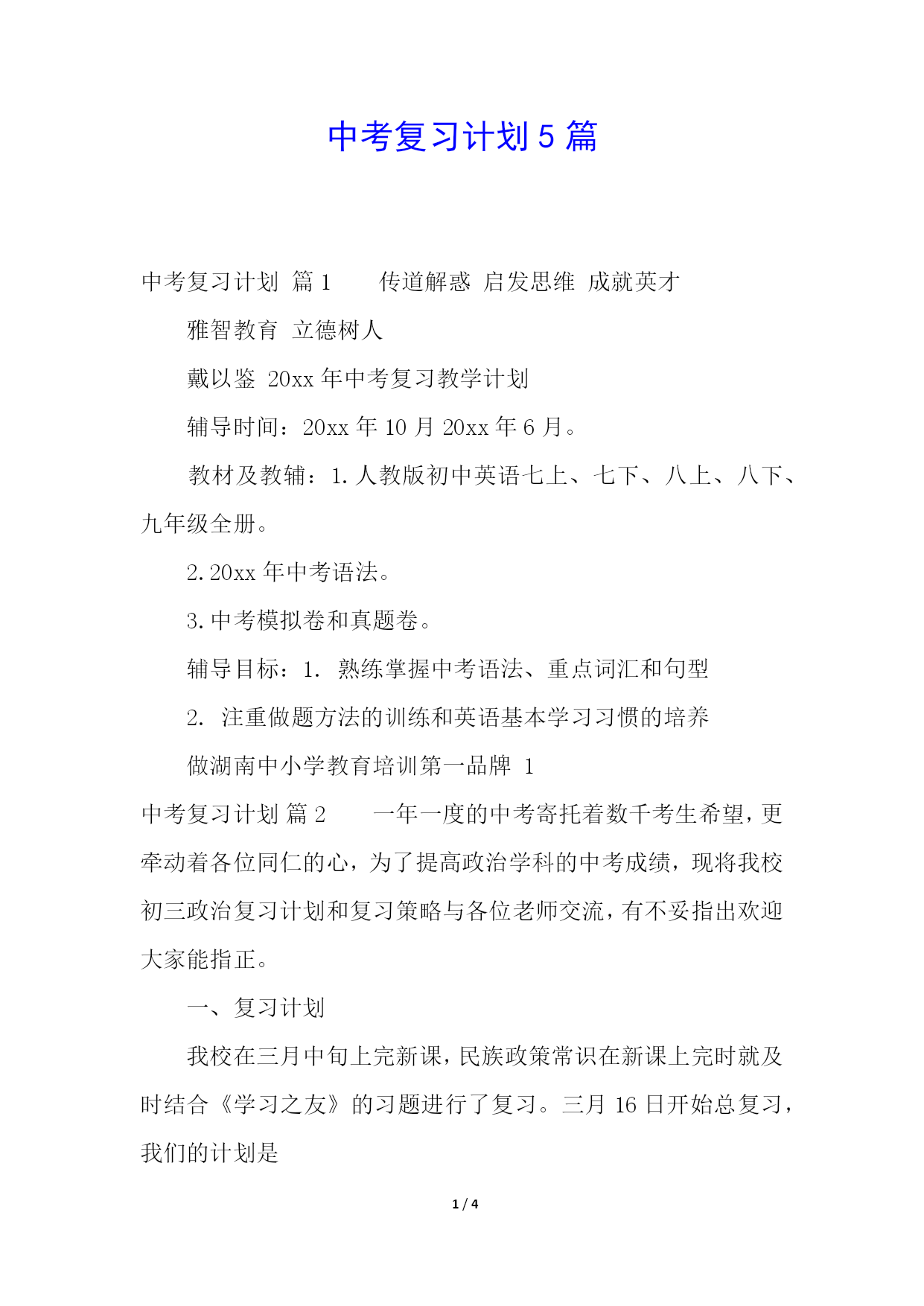 PAGE4/NUMPAGES4中考复习计划5篇中考复习计划篇1传道解惑启发思维成就英才雅智教育立德树人戴以鉴20xx年中考复习教学计划辅导时间:20xx年10月20xx年6月。教材及教辅:1.人教版初中英语七上、七下、八上、八下、九年级全册。2.20xx年中考语法。3.中考模拟卷和真题卷。辅导目标:1.熟练掌握中考语法、重点词汇和句型2.注重做题方法的训练和英语基本学习习惯的培养做湖南中小学教育培训第一品牌1中考复习计划篇2一年一度的中考寄托着数千考生希望,更牵动着各位同仁的心,为了提高政治学