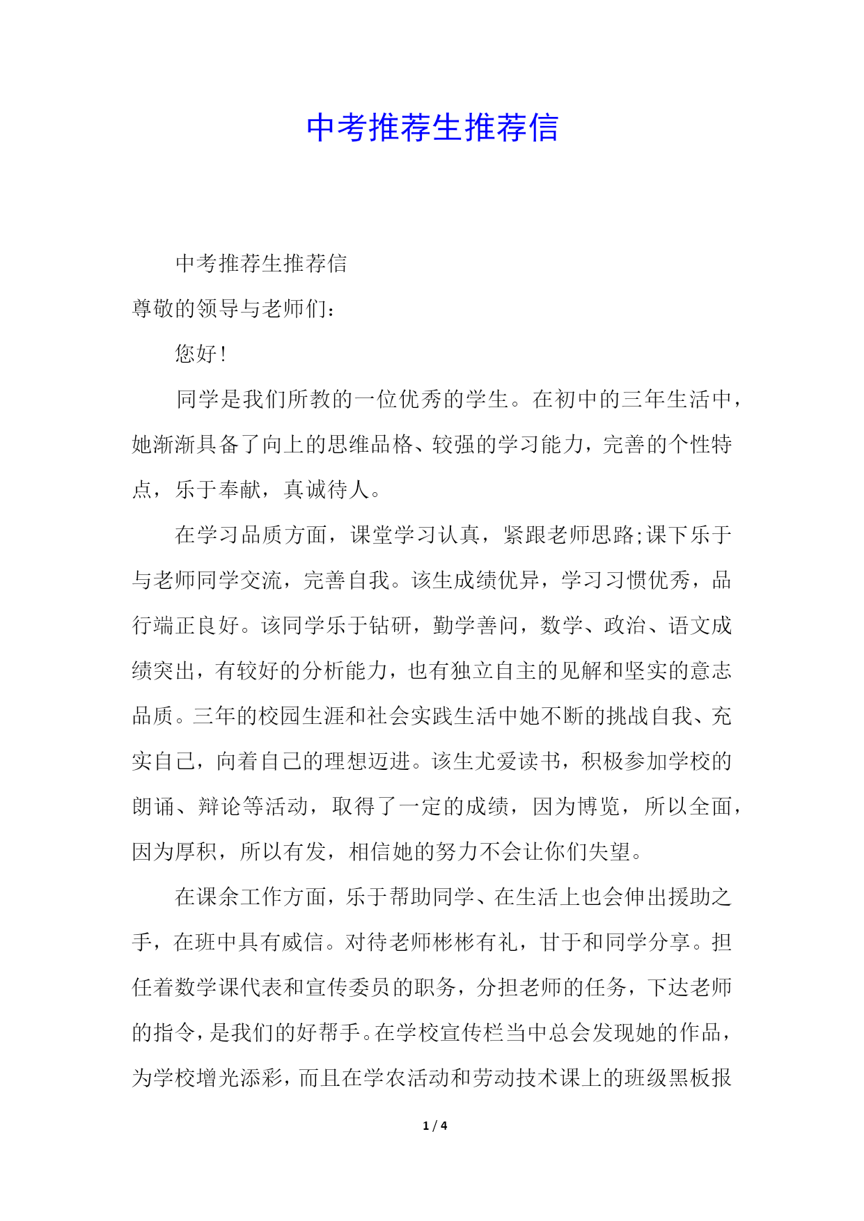 PAGE4/NUMPAGES4中考推荐生推荐信中考推荐生推荐信尊敬的领导与老师们:您好!同学是我们所教的一位优秀的学生。在初中的三年生活中,她渐渐具备了向上的思维品格、较强的学习能力,完善的个性特点,乐于奉献,真诚待人。在学习品质方面,课堂学习认真,紧跟老师思路;课下乐于与老师同学交流,完善自我。该生成绩优异,学习习惯优秀,品行端正良好。该同学乐于钻研,勤学善问,数学、政治、语文成绩突出,有较好的分析能力,也有独立自主的见解和坚实的意志品质。三年的校园生涯和社会实践生活中她不断的挑战自我、充实