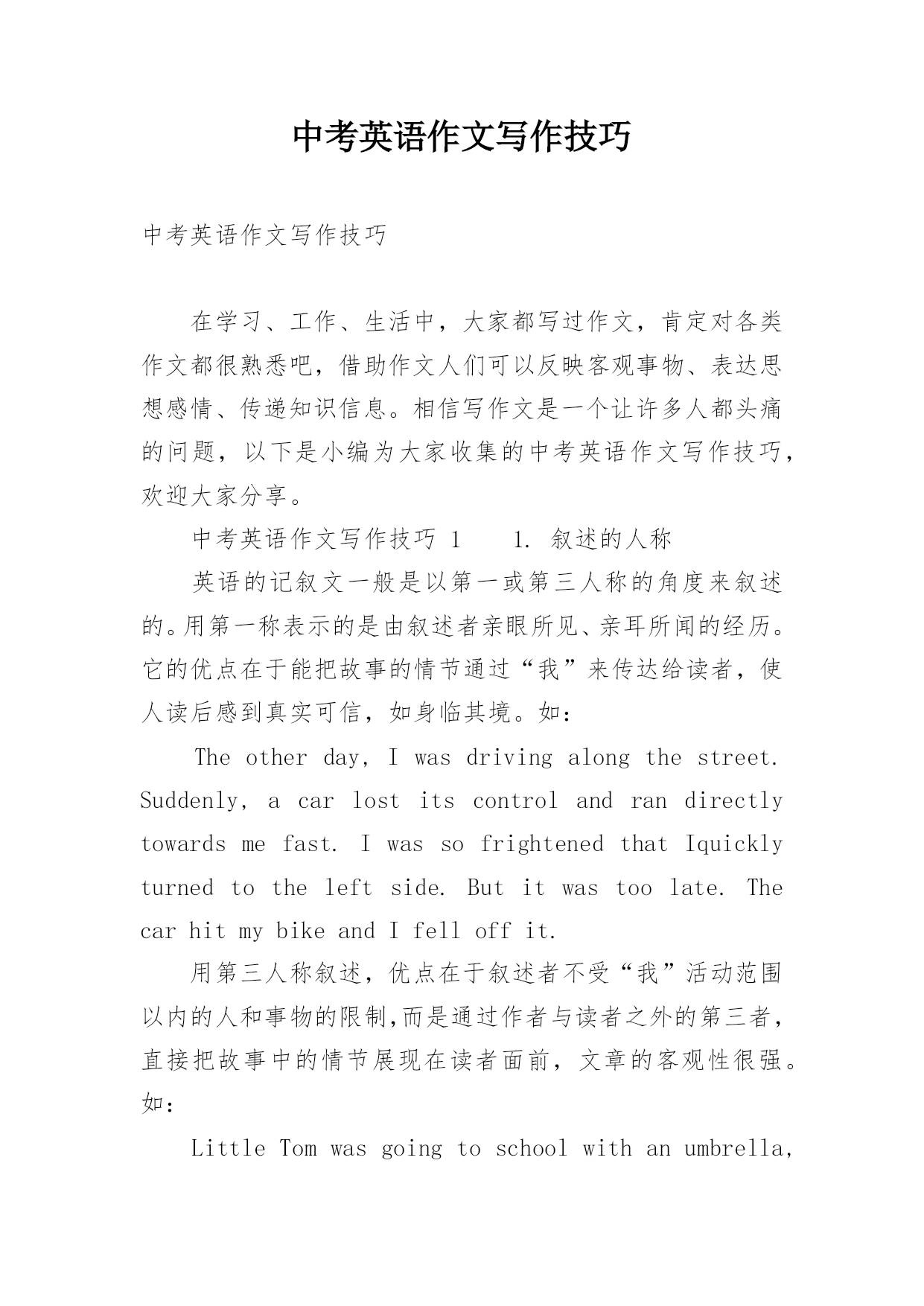 中考英语作文写作技巧中考英语作文写作技巧在学习、工作、生活中,大家都写过作文,肯定对各类作文都很熟悉吧,借助作文人们可以反映客观事物、表达思想感情、传递知识信息。相信写作文是一个让许多人都头痛的问题,以下是小编为大家收集的中考英语作文写作技巧,欢迎大家分享。中考英语作文写作技巧11.叙述的人称英语的记叙文一般是以第一或第三人称的角度来叙述的。用第一称表示的是由叙述者亲眼所见、亲耳所闻的经历。它的优点在于能把故事的情节通过“我”来传达给读者,使人读后感到真实可信,如身临其境。如:Theotherday,Iw