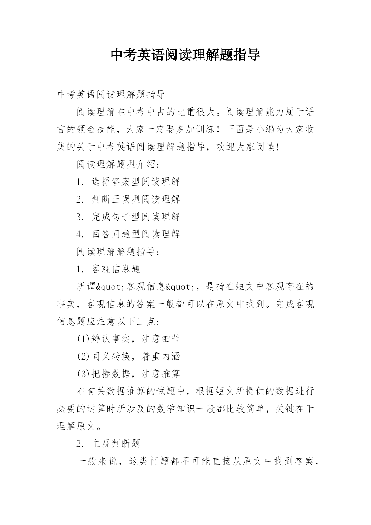 中考英语阅读理解题指导中考英语阅读理解题指导阅读理解在中考中占的比重很大。阅读理解能力属于语言的领会技能,大家一定要多加训练!下面是小编为大家收集的关于中考英语阅读理解题指导,欢迎大家阅读!阅读理解题型介绍:1.选择答案型阅读理解2.判断正误型阅读理解3.完成句子型阅读理解4.回答问题型阅读理解阅读理解解题指导:1.客观信息题所谓"客观信息",是指在短文中客观存在的事实,客观信息的答案一般都可以在原文中找到。完成客观信息题应注意以下三点:(1)辨认事实,注意细节(2)同义转换,着重内涵