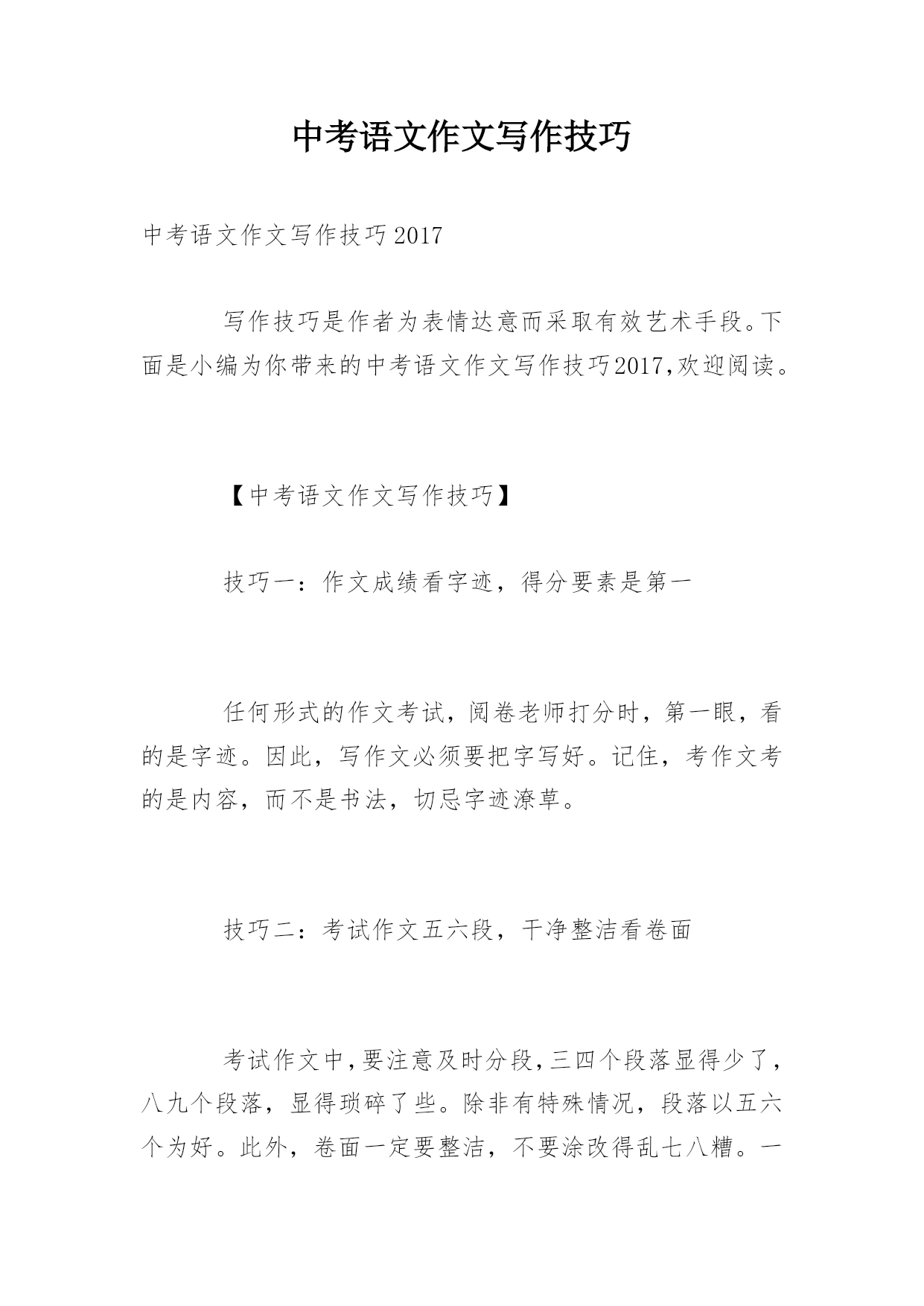 中考语文作文写作技巧中考语文作文写作技巧2017写作技巧是作者为表情达意而采取有效艺术手段。下面是小编为你带来的中考语文作文写作技巧2017,欢迎阅读。【中考语文作文写作技巧】技巧一:作文成绩看字迹,得分要素是第一任何形式的作文考试,阅卷老师打分时,第一眼,看的是字迹。因此,写作文必须要把字写好。记住,考作文考的是内容,而不是书法,切忌字迹潦草。技巧二:考试作文五六段,干净整洁看卷面考试作文中,要注意及时分段,三四个段落显得少了,八九个段落,显得琐碎了些。除非有特殊情况,段落以五六个为好。此外,卷面一定要