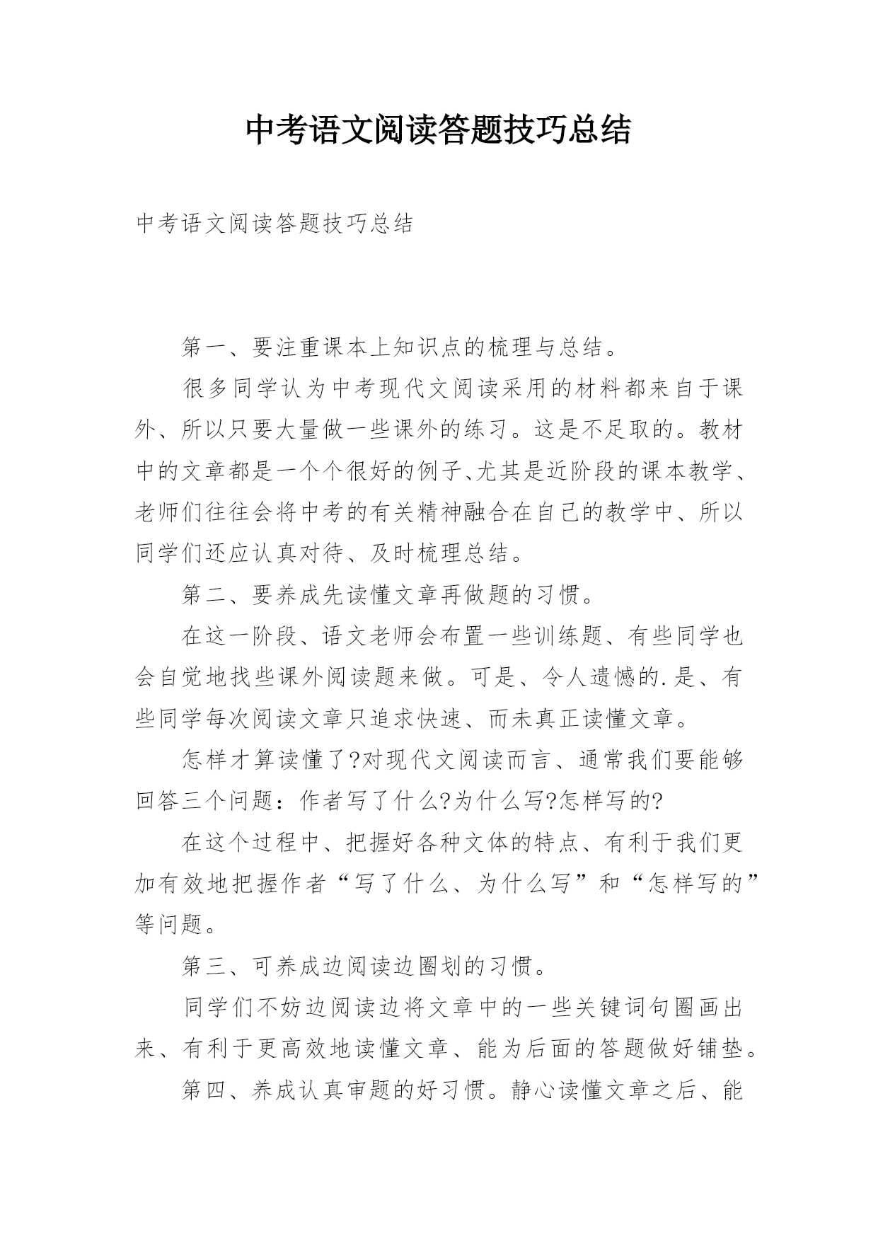 中考语文阅读答题技巧总结中考语文阅读答题技巧总结第一、要注重课本上知识点的梳理与总结。很多同学认为中考现代文阅读采用的材料都来自于课外、所以只要大量做一些课外的练习。这是不足取的。教材中的文章都是一个个很好的例子、尤其是近阶段的课本教学、老师们往往会将中考的有关精神融合在自己的教学中、所以同学们还应认真对待、及时梳理总结。第二、要养成先读懂文章再做题的习惯。在这一阶段、语文老师会布置一些训练题、有些同学也会自觉地找些课外阅读题来做。可是、令人遗憾的.是、有些同学每次阅读文章只追求快速、而未真正读懂文章。怎