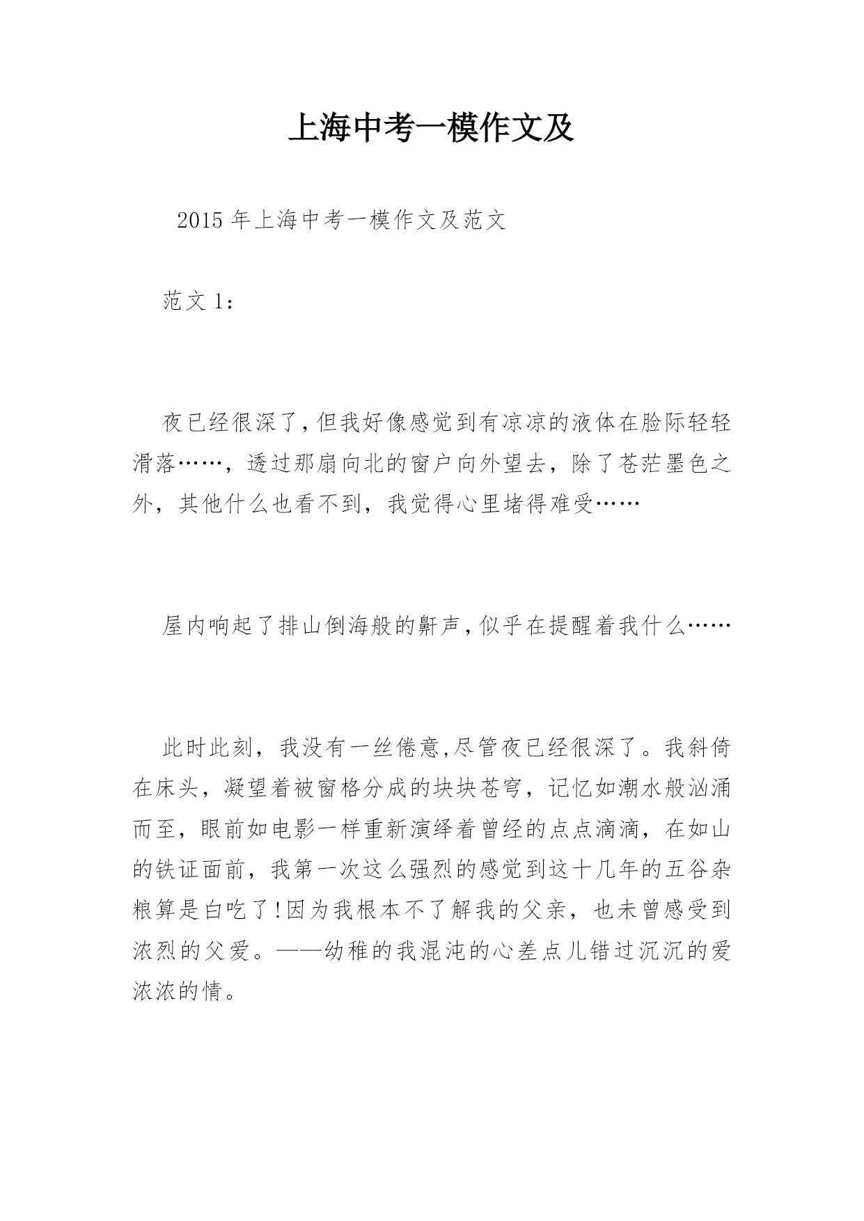 上海中考一模作文及2015年上海中考一模作文及范文范文1:夜已经很深了,但我好像感觉到有凉凉的液体在脸际轻轻滑落……,透过那扇向北的窗户向外望去,除了苍茫墨色之外,其他什么也看不到,我觉得心里堵得难受……屋内响起了排山倒海般的鼾声,似乎在提醒着我什么……此时此刻,我没有一丝倦意,尽管夜已经很深了。我斜倚在床头,凝望着被窗格分成的块块苍穹,记忆如潮水般汹涌而至,眼前如电影一样重新演绎着曾经的点点滴滴,在如山的铁证面前,我第一次这么强烈的感觉到这十几年的五谷杂粮算是白吃了!因为我根本不了解我的父亲,也未曾感受