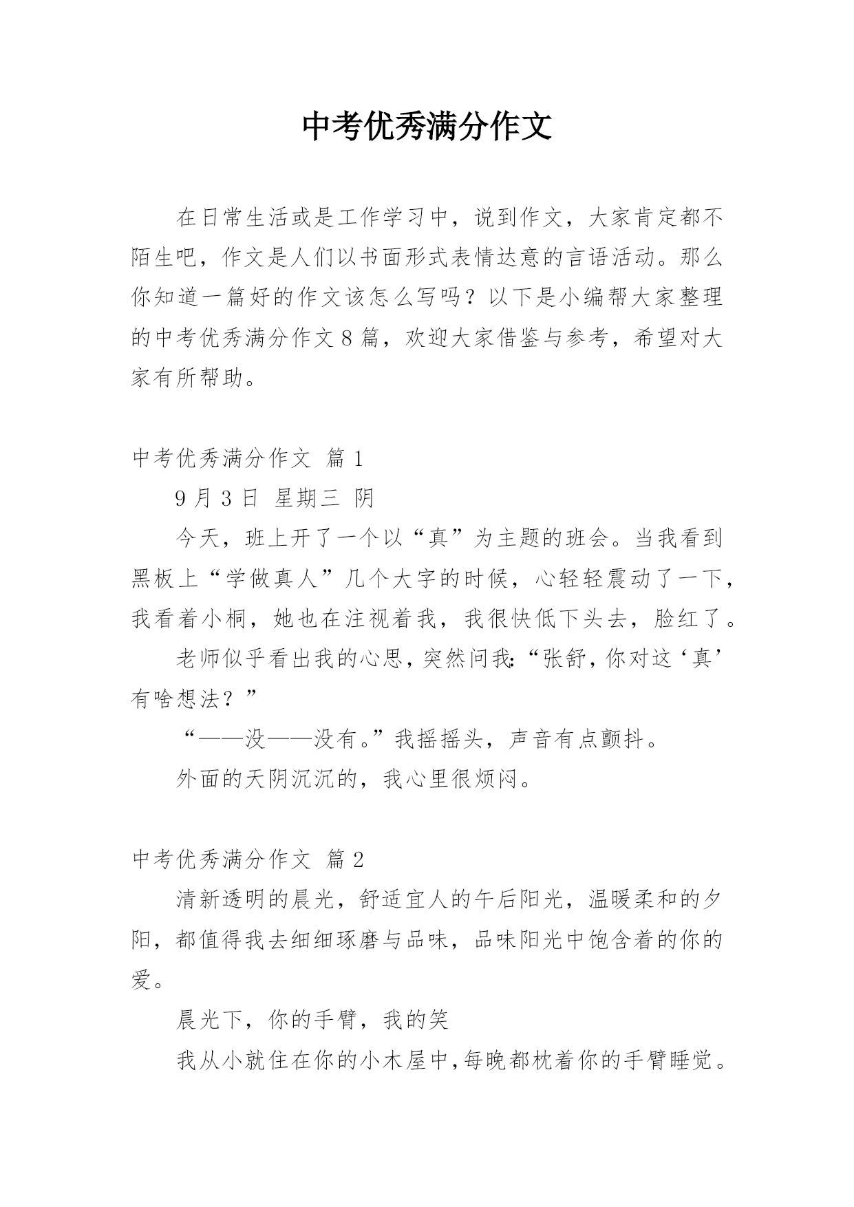 中考优秀满分作文在日常生活或是工作学习中,说到作文,大家肯定都不陌生吧,作文是人们以书面形式表情达意的言语活动。那么你知道一篇好的作文该怎么写吗?以下是小编帮大家整理的中考优秀满分作文8篇,欢迎大家借鉴与参考,希望对大家有所帮助。中考优秀满分作文篇19月3日星期三阴今天,班上开了一个以“真”为主题的班会。当我看到黑板上“学做真人”几个大字的时候,心轻轻震动了一下,我看着小桐,她也在注视着我,我很快低下头去,脸红了。老师似乎看出我的心思,突然问我:“张舒,你对这‘真’有啥想法?”“——没——没有。”我摇摇头