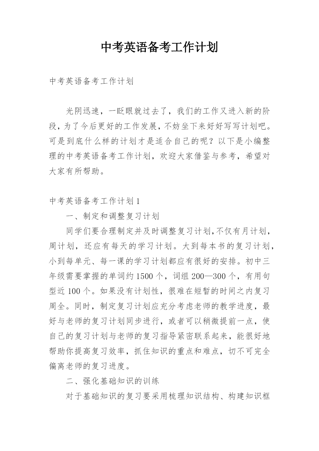 中考英语备考工作计划中考英语备考工作计划光阴迅速,一眨眼就过去了,我们的工作又进入新的阶段,为了今后更好的工作发展,不妨坐下来好好写写计划吧。可是到底什么样的计划才是适合自己的呢?以下是小编整理的中考英语备考工作计划,欢迎大家借鉴与参考,希望对大家有所帮助。中考英语备考工作计划1一、制定和调整复习计划同学们要合理制定并及时调整复习计划,不仅有月计划,周计划,还应有每天的学习计划。大到每本书的复习计划,小到每单元、每一课的学习计划都应有很好的安排。初中三年级需要掌握的单词约1500个,词组200—300个,