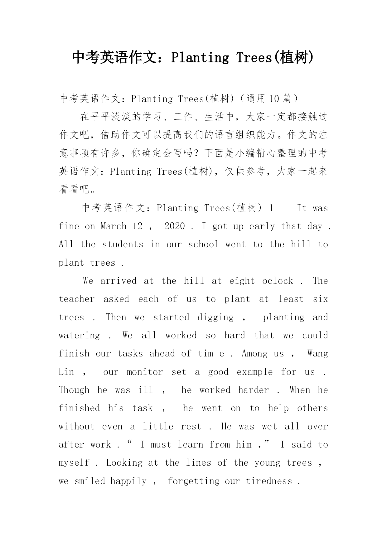 中考英语作文:PlantingTrees(植树)中考英语作文:PlantingTrees(植树)(通用10篇)在平平淡淡的学习、工作、生活中,大家一定都接触过作文吧,借助作文可以提高我们的语言组织能力。作文的注意事项有许多,你确定会写吗?下面是小编精心整理的中考英语作文:PlantingTrees(植树),仅供参考,大家一起来看看吧。中考英语作文:PlantingTrees(植树)1ItwasfineonMarch12,2020.Igotupearlythatday.Allthestudentsinour