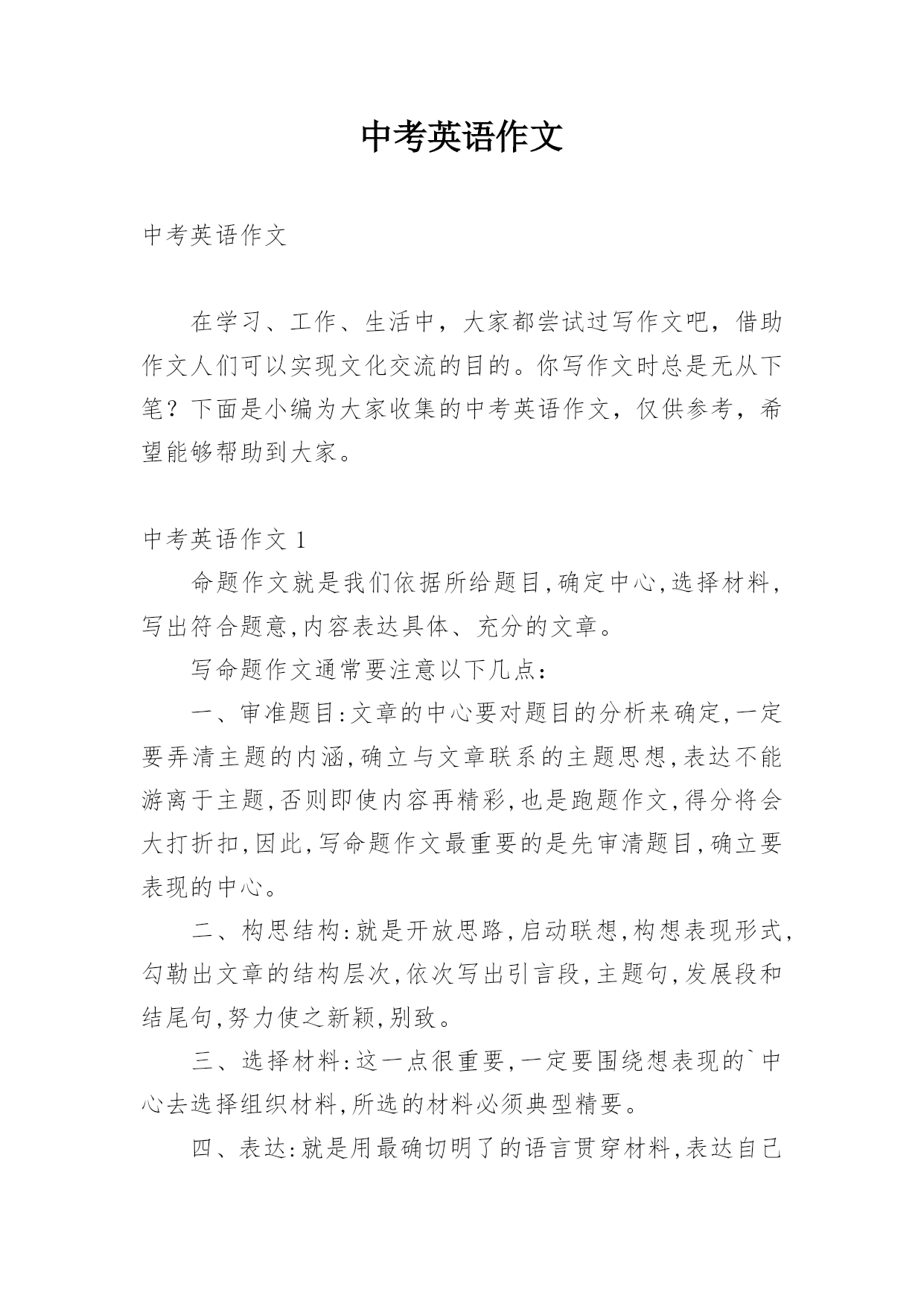 中考英语作文中考英语作文在学习、工作、生活中,大家都尝试过写作文吧,借助作文人们可以实现文化交流的目的。你写作文时总是无从下笔?下面是小编为大家收集的中考英语作文,仅供参考,希望能够帮助到大家。中考英语作文1命题作文就是我们依据所给题目,确定中心,选择材料,写出符合题意,内容表达具体、充分的文章。写命题作文通常要注意以下几点:一、审准题目:文章的中心要对题目的分析来确定,一定要弄清主题的内涵,确立与文章联系的主题思想,表达不能游离于主题,否则即使内容再精彩,也是跑题作文,得分将会大打折扣,因此,写命题作文