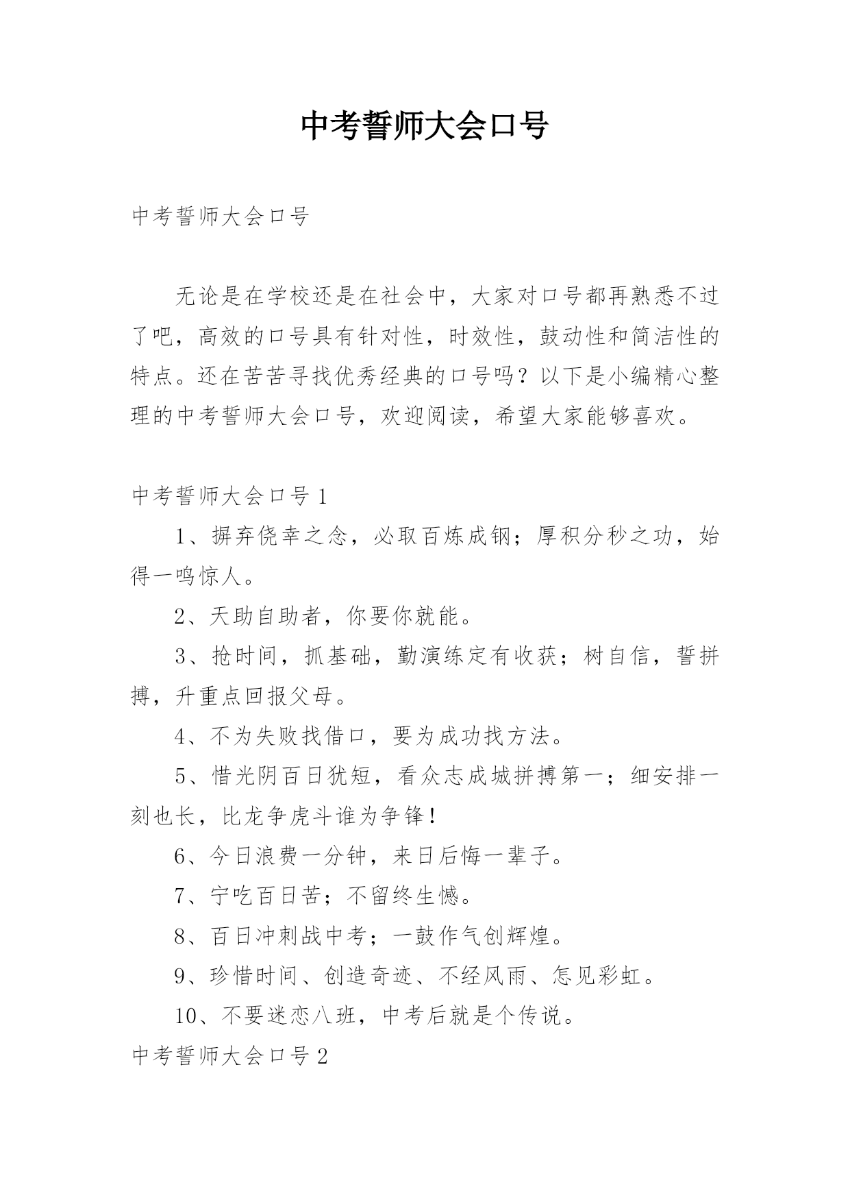 中考誓师大会口号中考誓师大会口号无论是在学校还是在社会中,大家对口号都再熟悉不过了吧,高效的口号具有针对性,时效性,鼓动性和简洁性的特点。还在苦苦寻找优秀经典的口号吗?以下是小编精心整理的中考誓师大会口号,欢迎阅读,希望大家能够喜欢。中考誓师大会口号11、摒弃侥幸之念,必取百炼成钢;厚积分秒之功,始得一鸣惊人。2、天助自助者,你要你就能。3、抢时间,抓基础,勤演练定有收获;树自信,誓拼搏,升重点回报父母。4、不为失败找借口,要为成功找方法。5、惜光阴百日犹短,看众志成城拼搏第一;细安排一刻也长,比龙争虎斗