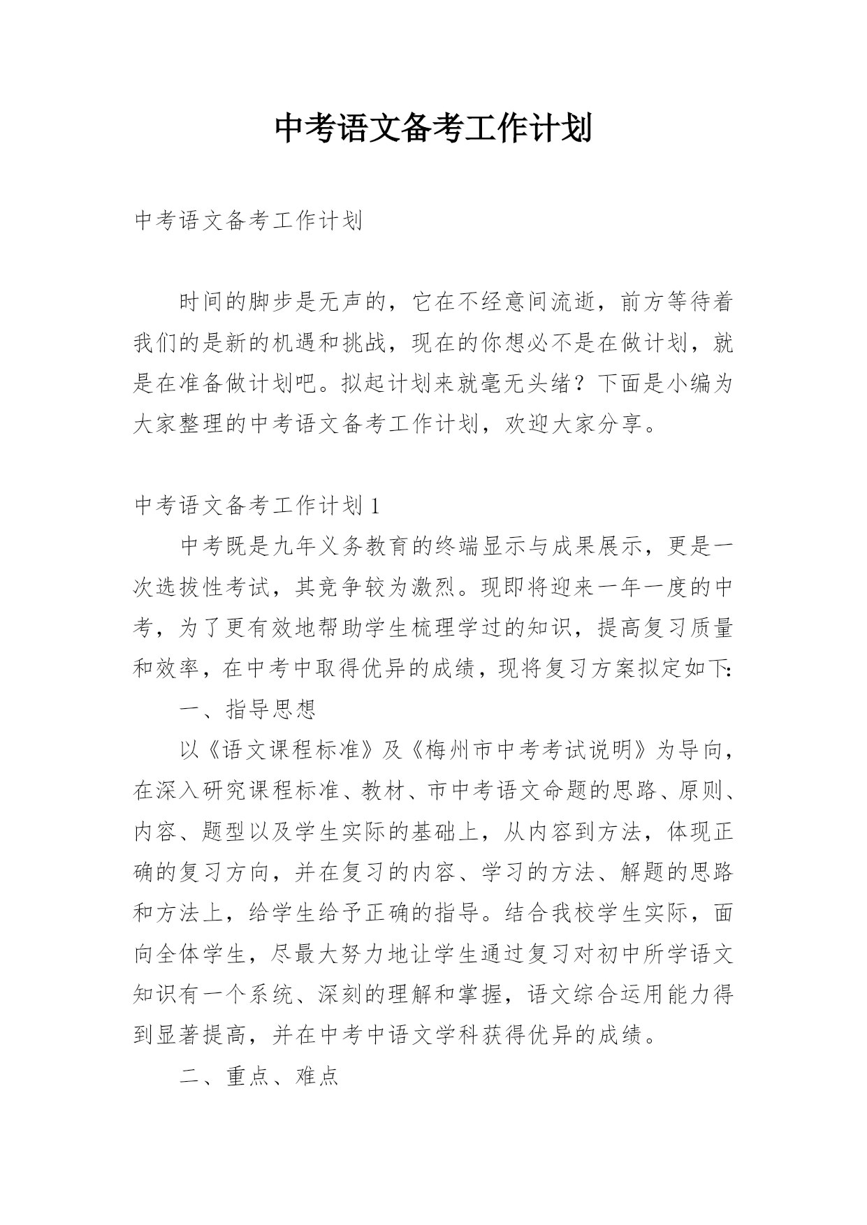 中考语文备考工作计划中考语文备考工作计划时间的脚步是无声的,它在不经意间流逝,前方等待着我们的是新的机遇和挑战,现在的你想必不是在做计划,就是在准备做计划吧。拟起计划来就毫无头绪?下面是小编为大家整理的中考语文备考工作计划,欢迎大家分享。中考语文备考工作计划1中考既是九年义务教育的终端显示与成果展示,更是一次选拔性考试,其竞争较为激烈。现即将迎来一年一度的中考,为了更有效地帮助学生梳理学过的知识,提高复习质量和效率,在中考中取得优异的成绩,现将复习方案拟定如下:一、指导思想以《语文课程标准》及《梅州市中考
