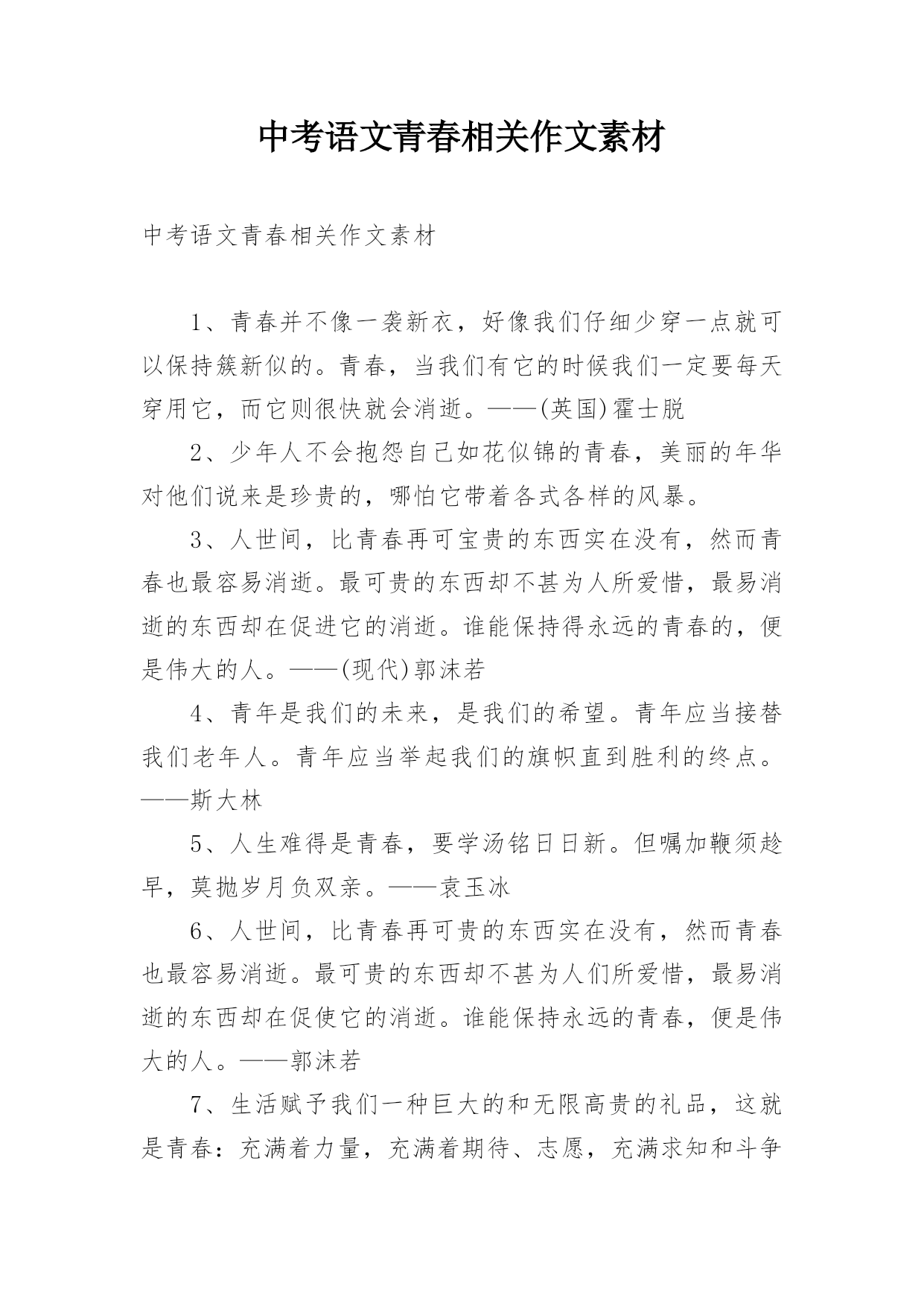 中考语文青春相关作文素材中考语文青春相关作文素材1、青春并不像一袭新衣,好像我们仔细少穿一点就可以保持簇新似的。青春,当我们有它的时候我们一定要每天穿用它,而它则很快就会消逝。——(英国)霍士脱2、少年人不会抱怨自己如花似锦的青春,美丽的年华对他们说来是珍贵的,哪怕它带着各式各样的风暴。3、人世间,比青春再可宝贵的东西实在没有,然而青春也最容易消逝。最可贵的东西却不甚为人所爱惜,最易消逝的东西却在促进它的消逝。谁能保持得永远的青春的,便是伟大的人。——(现代)郭沫若4、青年是我们的未来,是我们的希望。青年