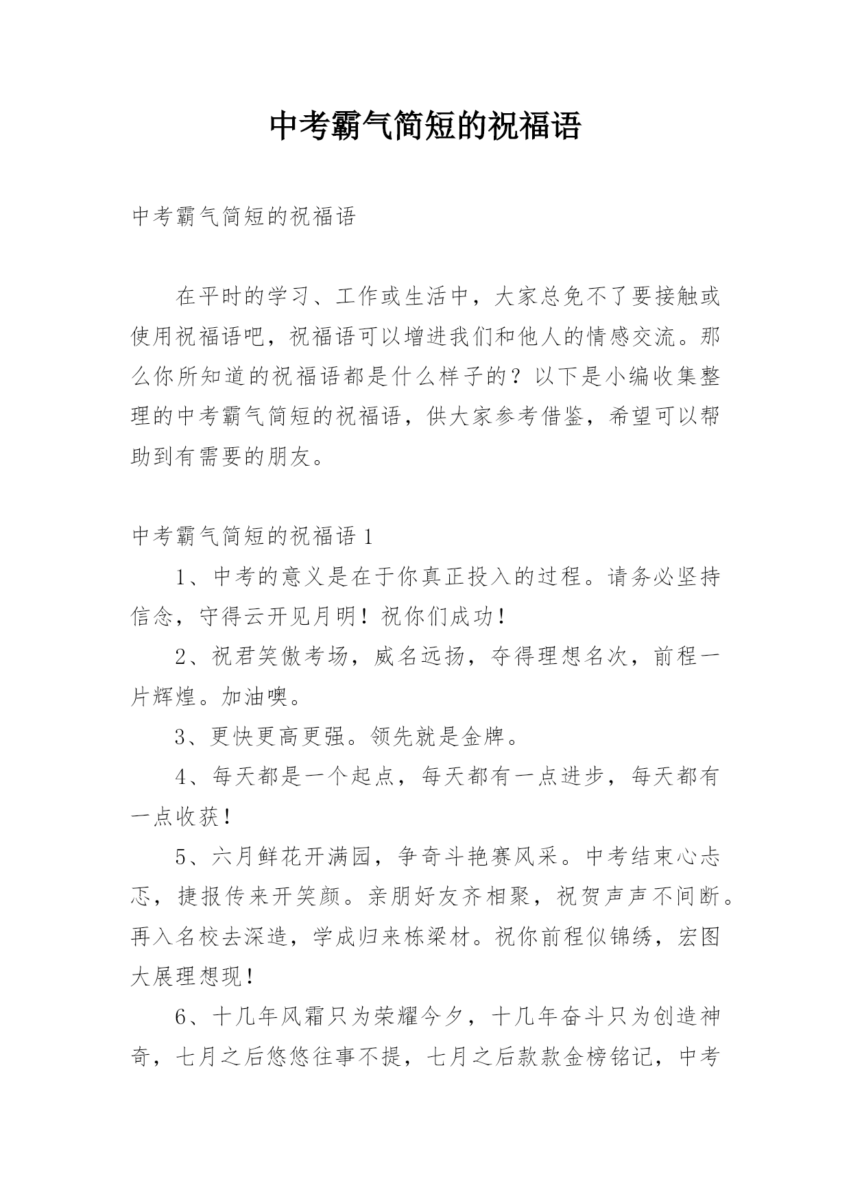 中考霸气简短的祝福语中考霸气简短的祝福语在平时的学习、工作或生活中,大家总免不了要接触或使用祝福语吧,祝福语可以增进我们和他人的情感交流。那么你所知道的祝福语都是什么样子的?以下是小编收集整理的中考霸气简短的祝福语,供大家参考借鉴,希望可以帮助到有需要的朋友。中考霸气简短的祝福语11、中考的意义是在于你真正投入的过程。请务必坚持信念,守得云开见月明!祝你们成功!2、祝君笑傲考场,威名远扬,夺得理想名次,前程一片辉煌。加油噢。3、更快更高更强。领先就是金牌。4、每天都是一个起点,每天都有一点进步,每天都有一